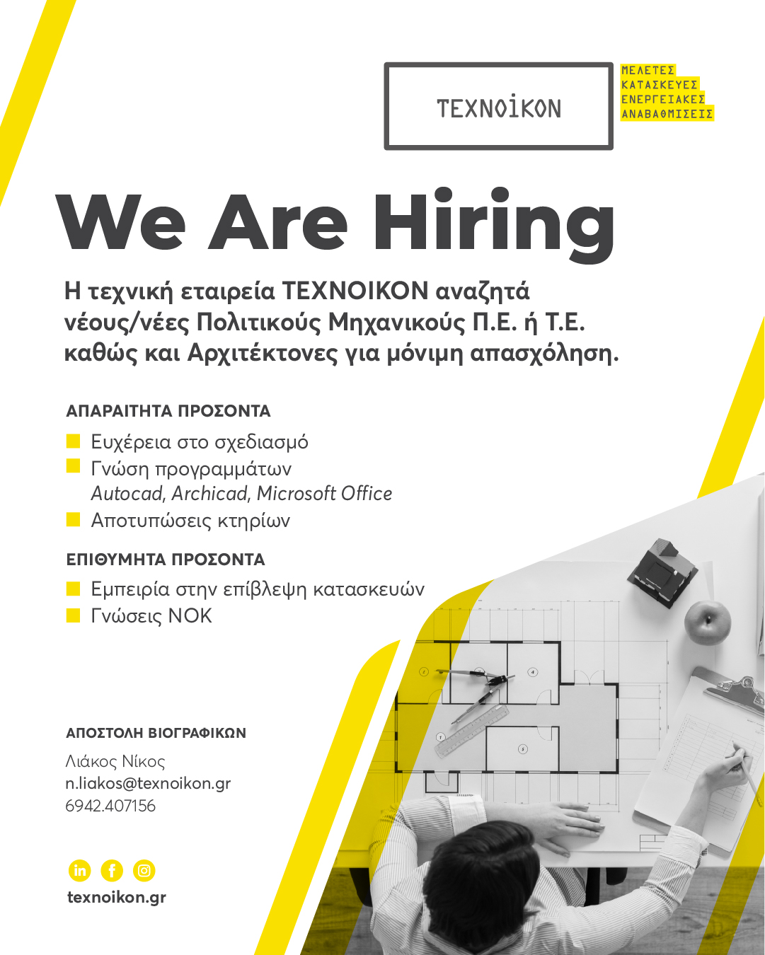 Η τεχνική εταιρεία ΤΕΧΝΟΙΚΟΝ αναζητά νέους/νέες Πολιτικούς Μηχανικούς Π.Ε. ή Τ.Ε., καθώς και Αρχιτέκτονες για μόνιμη απασχόληση.