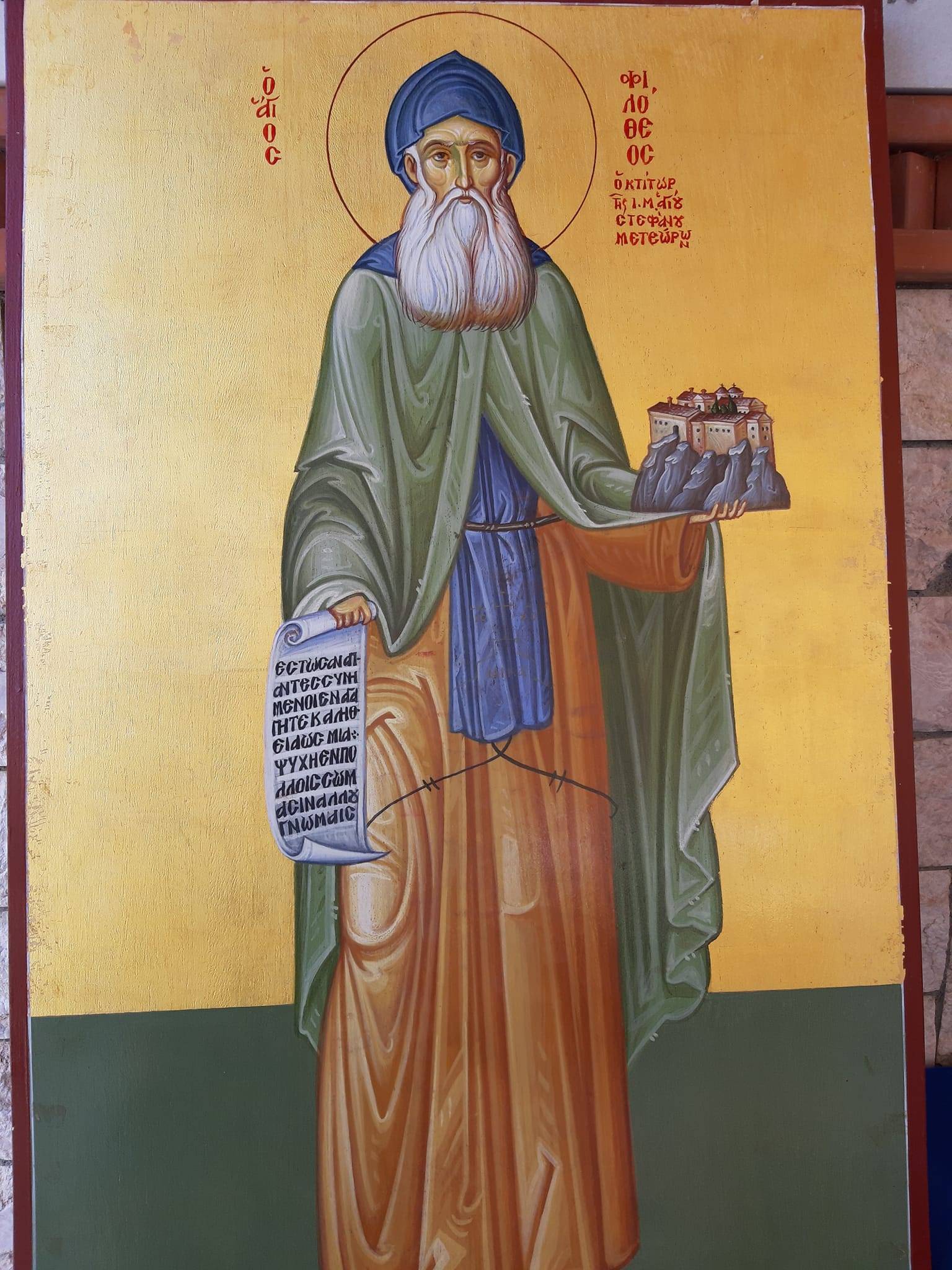 Καταλλήλως μίλησε στους πιστούς για το βίο του Αγίου ο Ιεροκήρυκας της Ιεράς Συνόδου π. Αχίλλιος Τσούτσουρας. Ο Όσιος Φιλόθεος ο εκ Σκλαταίνης (Ρίζωμα) έζησε μεταξύ των ετών 1475 μ.Χ. με 1550 μ.Χ., αν ληφθεί υπ’ όψιν ότι διετέλεσε ηγούμενος της Ιεράς Μονής Αγίου Στεφάνου Μετεώρων κατά το έτος 1545 μ.Χ. Ο Όσιος Φιλόθεος ήταν σύγχρονος με τον Άγιο Βησσαρίωνα Αρχιεπίσκοπο Λαρίσης και Τρίκκης (βλέπε 15 Σεπτεμβρίου) και κτίτορας της Μονής Μεταμορφώσεως του Σωτήρος (Δουσίκου).