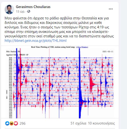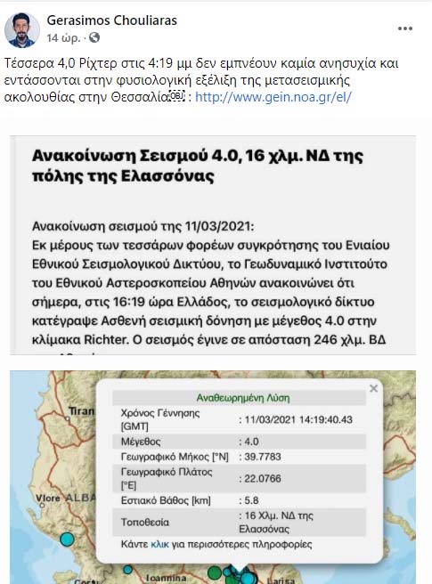 Συγκεκριμένα αναφέρουν ότι εντάσσεται στη φυσιολογική μετασεισμική ακολουθία και δεν θα πρέπει να ανησυχεί ιδιαίτερα τους κατοίκους της περιοχής. Υπενθυμίζεται ότι και ο Θανάσης Γκανάς είχε δηλώσει χθες ότι θα πρέπει να περιμένουμε ισχυρό μετασεισμό, ενώ και ο Γεράσιμος Χουλιάρας του Γεωδυναμικού Ινστιτούτου κάνει λόγο σε αναρτήσεις του τις τελευταίες ώρες για ομαλή μετασεισμική ακολουθία. Δείτε χαρακτηριστικά: