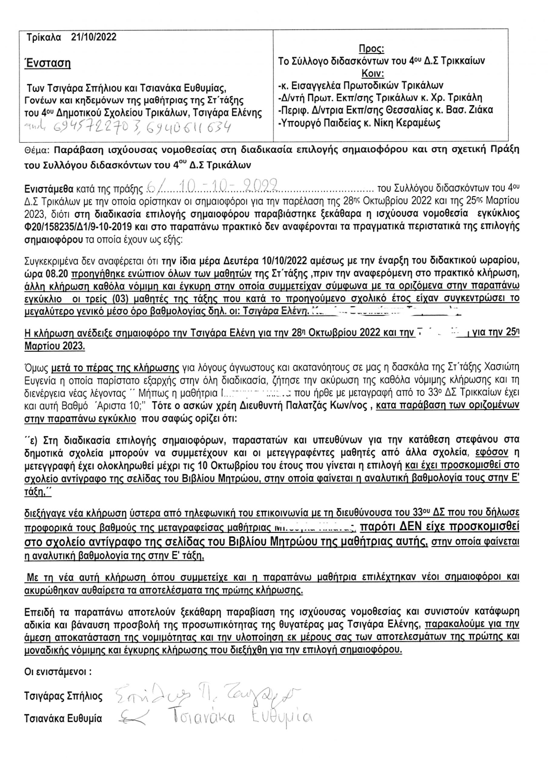 Ο Σπήλιος Τσιγάρας δίνει μια άλλη διάσταση στην υπόθεση και μέσω του trikalavoice.gr κοινοποιεί αφενός την ένσταση που έχει καταθέσει για τη διαδικασία επιλογής σημαιοφόρου στον Σύλλογο Διδασκόντων του 4ου Δ.Σ. Τρικάλων, αφετέρου δε το e-mail δέχθηκε από τον διευθυντή του Σχολείου Κώστα Παλλαντζά ήδη από την περασμένη Πέμπτη και στο οποίο αναφέρει: «Σπήλιο καλησπέρα. Σου είπα από την πρώτη στιγμή ότι στο συγκεκριμένο ζήτημα το λάθος είναι δικό μου και ζήτησα ειλικρινά συγνώμη, τόσο από εσένα όσο και-πολύ περισσότερο-από την Ελενίτσα, η οποία καταφανώς αδικήθηκε από την όλη εξέλιξη. Το καλύτερο που μπορώ πλέον να κάνω, έτσι που τα «κατάφερα», είναι να εξασφαλίσω πως το κορίτσι θα παρελάσει δίπλα στη σημαία, όπως και θα γίνει. Εσύ, ως γονιός, έχεις φυσικά το δικαίωμα να επιδιώξεις την επανόρθωση της αδικίας με κάθε πρόσφορο μέσο. Σε ό,τι αφορά το ύφος μου, κατά την τελευταία τηλεφωνική μας συνομιλία, είναι κάτι που δεν το συνηθίζω και οπωσδήποτε δεν το επικροτώ».