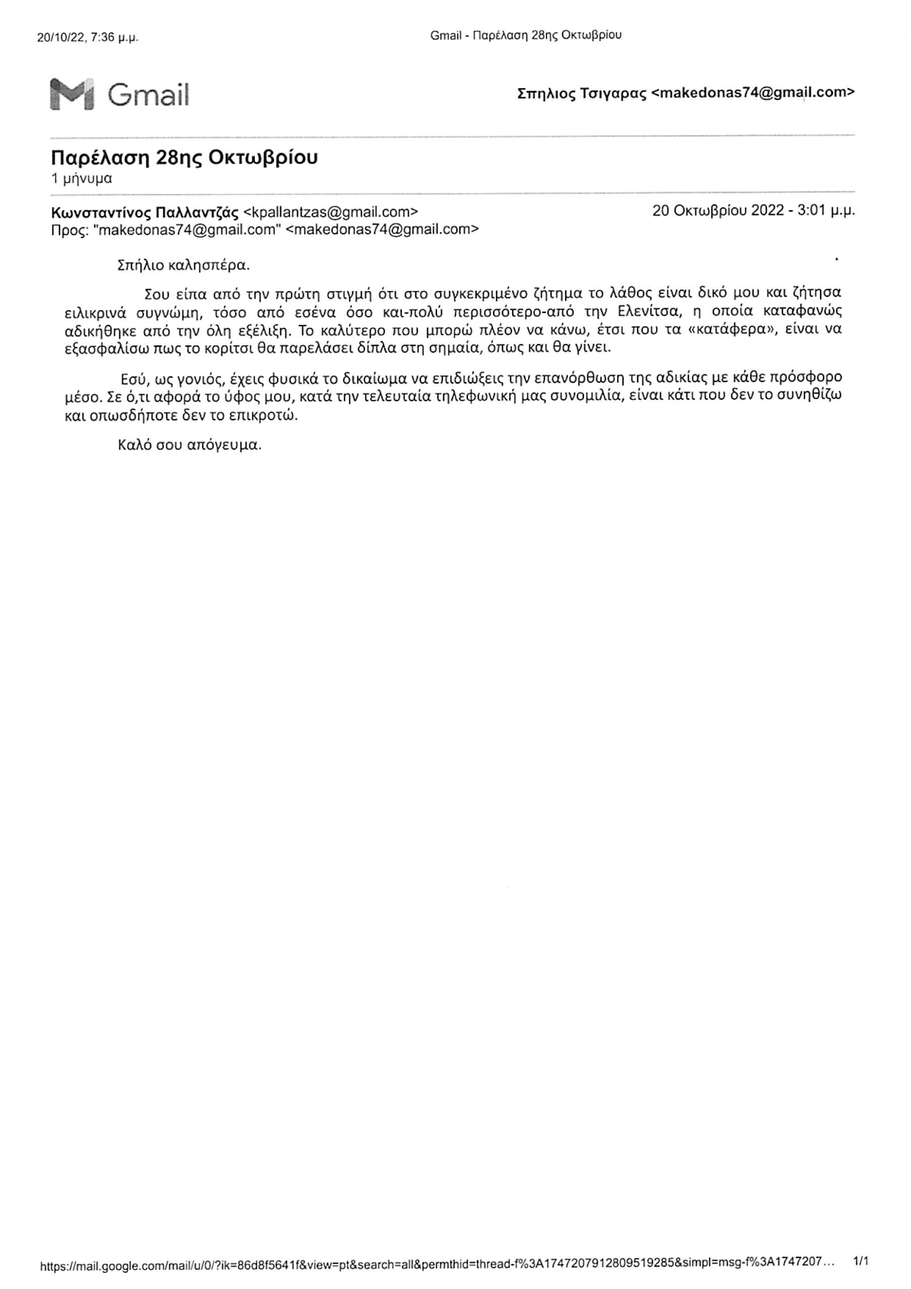 Σε νεότερη δήλωσή του ο ίδιος επισημαίνει: “1. ουδέποτε συνέβη κανενός είδους επεισόδιο με κανέναν και γι αυτό υπάρχουν μάρτυρες 2. Ο Διευθυντής όπως ομολογεί στο συνημμενο mail παραβίασε με πρωτοφανή τρόπο τη νομοθεσία και πρέπει να ελεγχθεί από την πρoϊσταμένη του αρχή. Ταυτόχρονα με εξύβρισε και με απείλησε ήδη 3. Η προϊσταμένη αρχή δια του υπεύθυνου εκπαιδευτικών θεμάτων κ.Λαρίση με διαβεβαίωσε ότι θα αποκαθιστούσε τη νομιμότητα αλλά δεν το έπραξε και είναι υπόλογη 4. τα υπόλοιπα συνιστούν ξεκάθαρη απόπειρα σπίλωσης και συκοφαντικής δυσφήμισης του προσώπου μου και βάναυση προσβολή της προσωπικότητας της κόρης μου γεγονός για το οποίο οι υπαίτιοι θα λογοδοτήσουν στη δικαιοσύνη 5. είναι ντροπή να διδάσκονται οι μαθητές το ψεύδος και την αδικία 6. Ήδη από χθές έχω κάνει αναφορά στην εισαγγελία για το θέμα”.