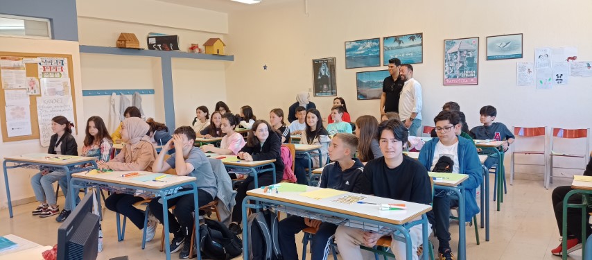 Έγινε ανταλλαγή πληροφοριών για την λειτουργία των σχολείων και τα προγράμματα σπουδών και των δύο χωρών. Ακολούθησε η υλοποίηση μαθημάτων στην Αγγλική γλώσσα, τα οποία παρακολούθησαν οι φιλοξενούμενοι μαθητές/τριες και εκπαιδευτικοί μαζί με τους Έλληνες μαθητές/τριες. Στο πλαίσιο του μαθήματος των Αγγλικών με υπεύθυνη εκπαιδευτικό την κ. Κλιάφα Βικτωρία πραγματοποιήθηκαν δραστηριότητες γνωριμίας των παιδιών του τμήματος Α2 με τους Τούρκους μαθητές/τριες με κύριο στόχο την διερεύνηση των κοινών στοιχείων που μπορούν να φέρουν κοντά τους εφήβους δύο διαφορετικών λαών. Οι μαθητές/τριες κατασκεύασαν ένα πόστερ και χάρτινες κάρτες, ενεργοποίησαν τις γνώσεις τους στα Αγγλικά με δημιουργικό τρόπο και συνεργάστηκαν αρμονικά για να χτιστεί μια γέφυρα φιλίας και επικοινωνίας μέσω του προγράμματος Erasmus. Ακολούθησε η υλοποίηση ενός μαθήματος Φυσικής από την κ. Παπαβασιλείου Βασιλική. Οι μαθητές/τριες χωρίστηκαν σε μικτές ομάδες και συμπλήρωσαν φύλλα εργασίας, αφού παρακολούθησαν εικονικά πειράματα από το Πανεπιστήμιο του Colorado σχετικά με το ηλεκτρικό ρεύμα. Την επόμενη διδακτική ώρα η φιλόλογος κ. Κανάτα Αθηνά με τους φιλοξενούμενους μαθητές/τριες και τους μαθητές/τριες της Γ τάξης «κάθισαν στο ίδιο τραπέζι». Αφού κάθε παιδί γνώρισε και σύστησε το διπλανό του, μέσω της παρουσίασης με τίτλο «Lets eat together» αναγνώρισαν φαγητά, σαλάτες και γλυκά με κοινή ονομασία στις δύο γλώσσες.