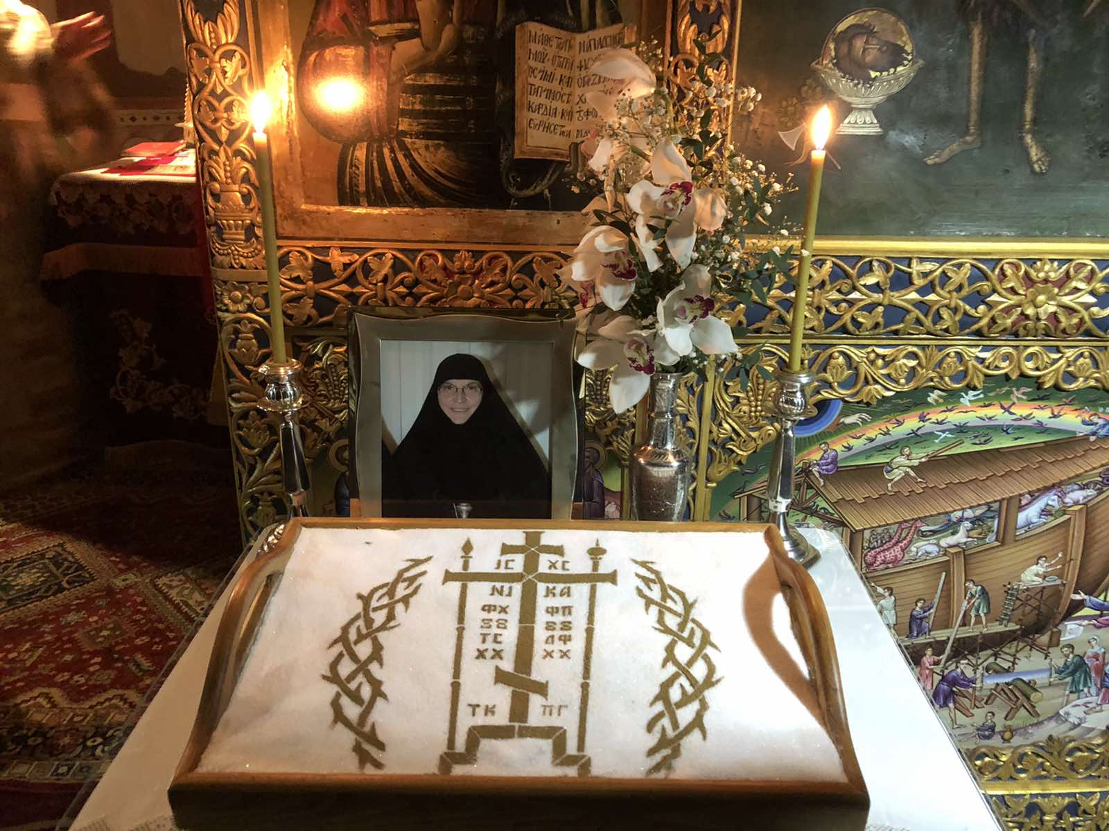 Σήμερα στο σεπτό μνήμα της, μαζί με δυο αδελφές που τόσο αγάπησε και υποδειγματικά συμπορεύτηκε, μέσα στην όμορφη ηρεμία της φύσης και στην δροσιά της Ιεράς Μονής, η ιλαρή φλόγα του κανδηλίου επί του σεπτού μνήματός της, θα υπενθυμίζει στους ευλαβείς προσκυνητές, ότι εδώ αναπαύεται το χοϊκό σώμα μιας αφιερωμένης γερόντισσας, μιας μοναδικής πνευματικής μητέρας και ενός ανυπόκριτου, ανεπανάληπτου και αληθινού ανθρώπου του Θεού. Μιας γερόντισσας που μας υπογραμμίζει: Τί δεδοίκαμεν, εἰπέ μοι; Τὸν θάνατον; Ἐμοὶ τὸ ζῇν Χριστὸς, καὶ τὸ ἀποθανεῖν κέρδος. Ἔγειρε, μὴ φοβοῦ, στήθι· Χριστός Ἀνέστη! Ἀληθῶς Ανέστη!