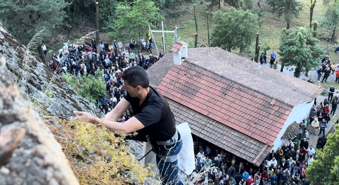 Τηρήθηκε και φέτος το έθιμο του Αϊ Γιώργη του Μανδηλά στα Μετέωρα με δεκάδες πιστούς να αναρριχούνται και να εναποθέτουν το μαντήλι τους στο εκκλησάκι που είναι σμηλεμένο στον απόκρυμνο βράχο.