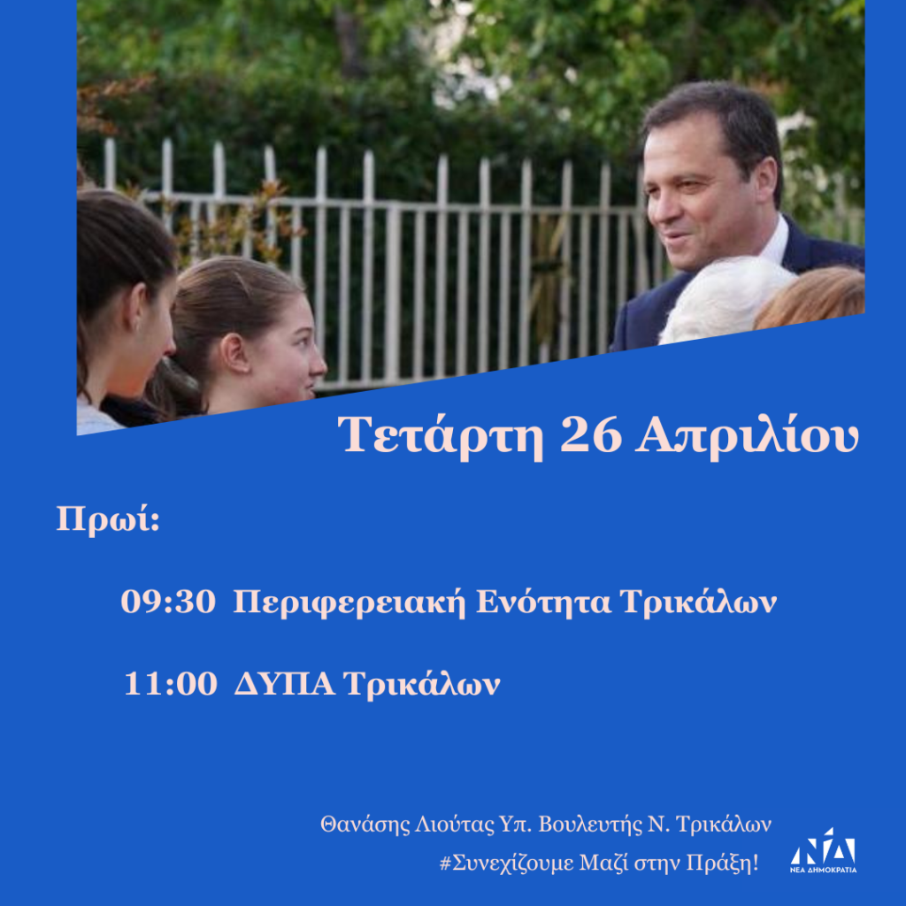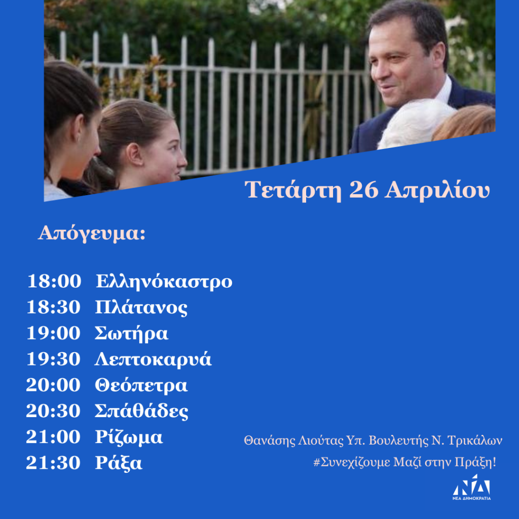 Το αυριανό πρόγραμμα περιοδειών του Θανάση Λιούτα Βασίλης Αλεξίου 3 έτη ago Πρόγραμμα Περιοδειών Θανάση Λιούτα: Τετάρτη 26 Απριλίου 2023 Πρωί: 9:30 Περιφερειακή Ενότητα Τρικάλων 11:00 ΔΥΠΑ Τρικάλων Απόγευμα: 18:00 Ελληνόκαστρο 18:30 Πλάτανος 19:00 Σωτήρα 19:30 Λεπτοκαρυά 20:00 Θεόπετρα 20:30 Σπαθάδες 21:00 Ρίζωμα 21:30 Ράξα