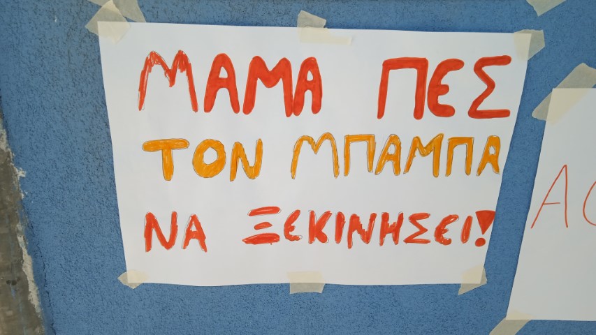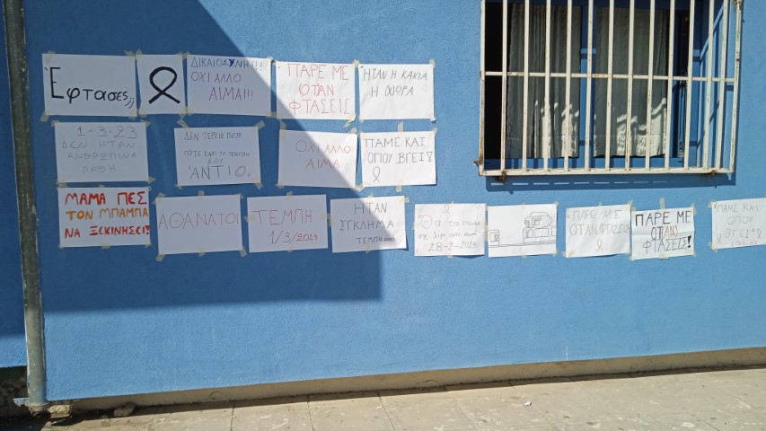 Οι μαθητές/τριες εξέφρασαν την θλίψη τους για το σιδηροδρομικό δυστύχημα των Τεμπών με συνθήματα που έγραψαν σε κόλλες χαρτιού, σχημάτισαν με τις τσάντες τους το πένθιμο σύμβολο και κράτησαν ενός