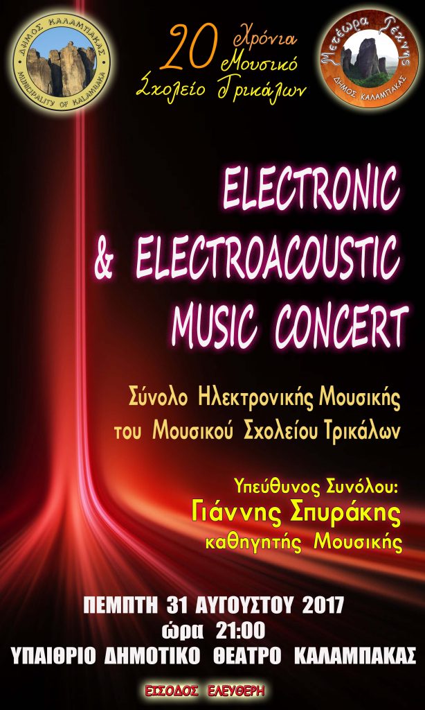 Το Μουσικό Σχολείο Τρικάλων εν όψει της συμπλήρωσης των 20 χρόνων λειτουργίας του συμμετέχει στο πολιτιστικό καλοκαίρι «Μετέωρα Τέχνης 2017», που διοργανώνει ο Δήμος Καλαμπάκας, με συναυλία ηλεκτρονικής μουσικής την Πέμπτη 31 Αυγούστου 2017 στο υπαίθριο δημοτικό θέατρο Καλαμπάκας και ώρα 21:00 με ελεύθερη είσοδο. Συμμετέχει το Σύνολο Ηλεκτρονικής Μουσικής του σχολείου υπό τον καθηγητή κ. Γιάννη Σπυράκη.