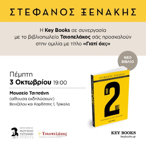 Οι Key Books σε συνεργασία με το βιβλιοπωλείο Τσιοπελάκος, σας προσκαλούν στην ομιλία του Στέφανου Ξενάκη με τίτλο ” Γιατί Όχι”, την Πέμπτη 3 Οκτωβρίου και ώρα 19:00 στην αίθουσα εκδηλώσεων του Μουσείου Τσιτσάνη (Βενιζέλου και Καρδίτσης 1, Τρίκαλα).