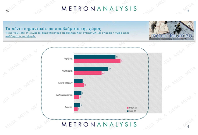 Είναι χαρακτηριστικό ότι στη χθεσινή δημοσκόπηση της Metron Analysis που παρουσιάστηκε από το Mega η ακρίβεια εξακολουθεί να θεωρείται το μεγαλύτερο πρόβλημα για τους πολίτες, ωστόσο η τάση είναι σημαντικά πτωτική σε σχέση με τον Μάρτιο, πέφτοντας από το 37 στο 33%.