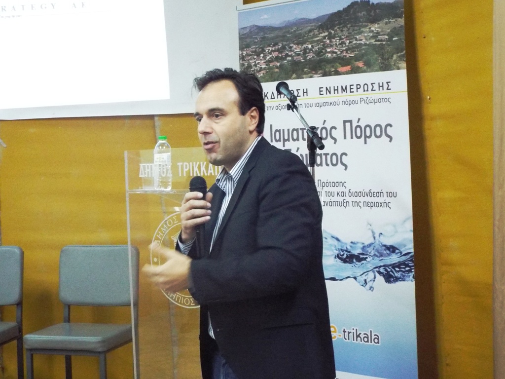 Στην εκδήλωση της Πέμπτης, ο μελετητής κ. Γιαννάτος (εκπρόσωπος της εταιρείας «CORE STRATEGY – Σύμβουλοι Επιχειρήσεων A.E.»), που εκπονεί τη μελέτη με τίτλο «Αξιοποίηση και ανάδειξη του ιαματικού φυσικού πόρου Ριζώματος Δήμου Τρικκαίων και τη στρατηγική τουριστικής ανάπτυξης της περιοχής», παρουσίασε το αρχικό σχέδιο. Μίλησε για τα δεδομένα, τον σχεδιασμό, τους στόχους του εγχειρήματος, με βάση την κατάσταση στην Ελλάδα και στα Βαλκάνια. Παρουσίασε τα προσχέδια των χώρων, απάντησε σε ερωτήσεις διευκρινιστικού χαρακτήρα για θέματα χρηματοδότησης, προσωπικού, έκτασης, χωροθέτησης, αξιοποίησης, προοπτικής. Μίλησε για τον χαρακτήρα του έργου, για τις πιθανές συμπράξεις, για τους τρόπους ένταξης του εγχειρήματος στην τουριστική αγορά των Τρικάλων, για τις δυνατότητες διεξόδου από την ανεργία.