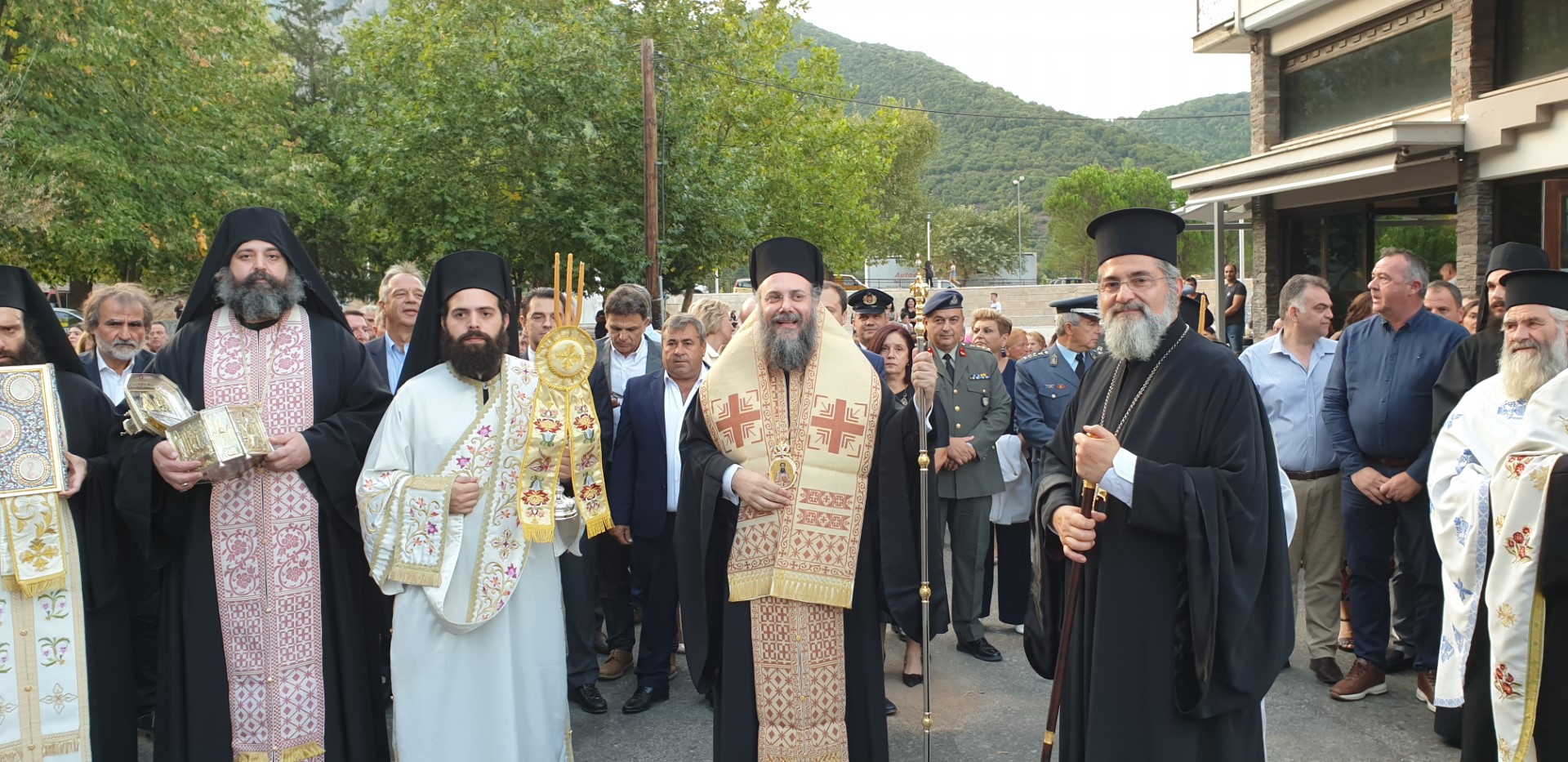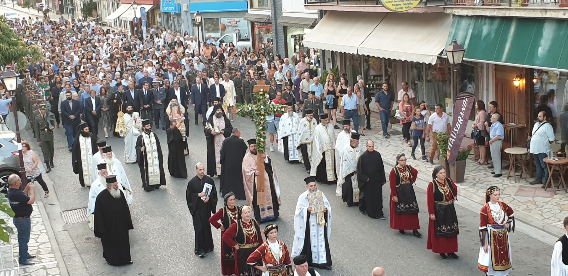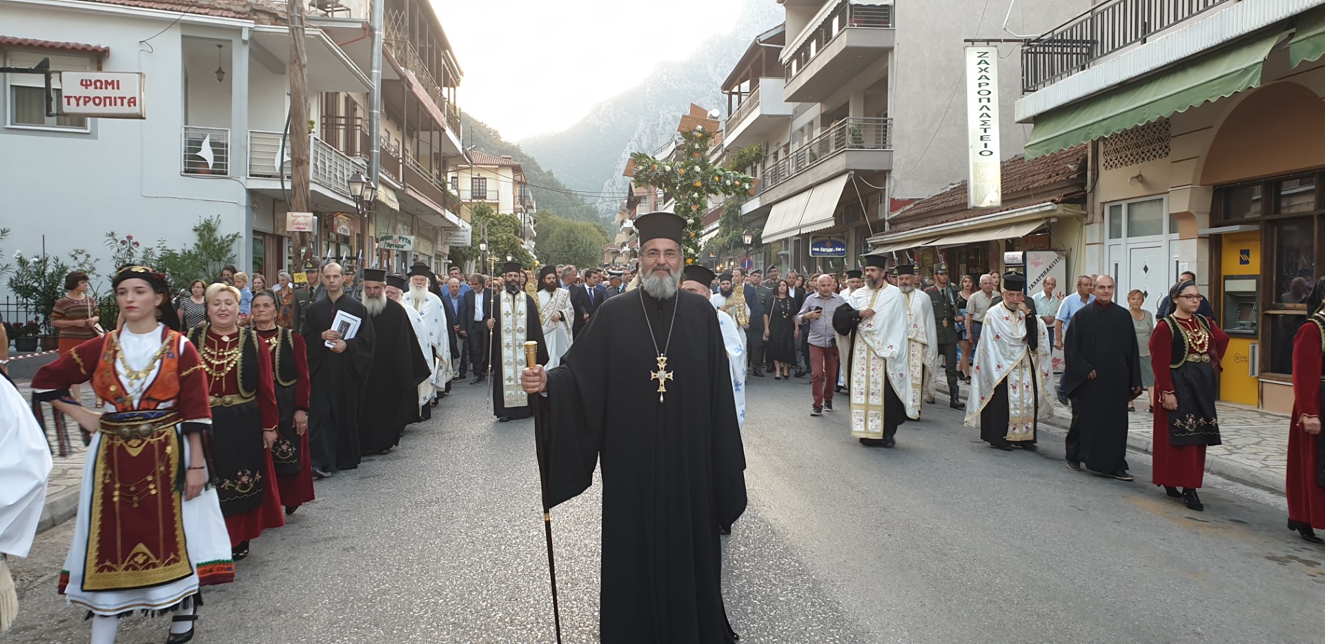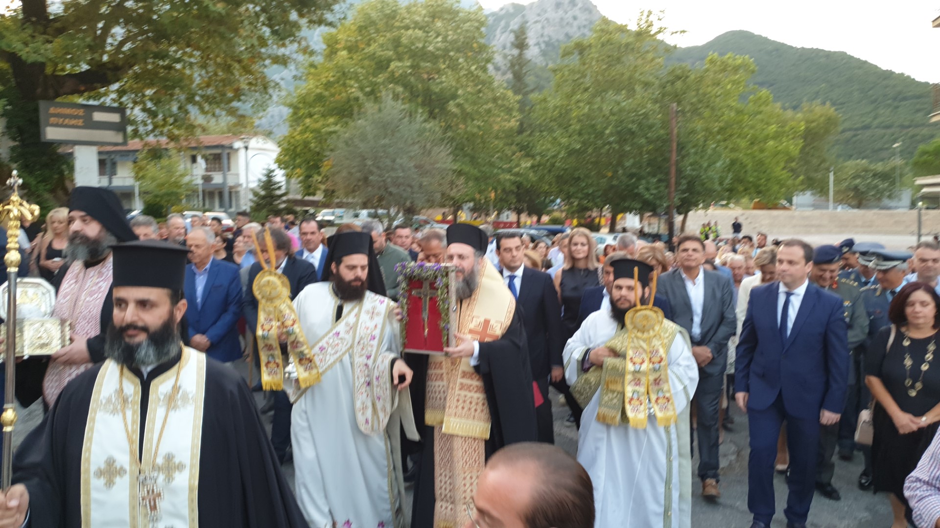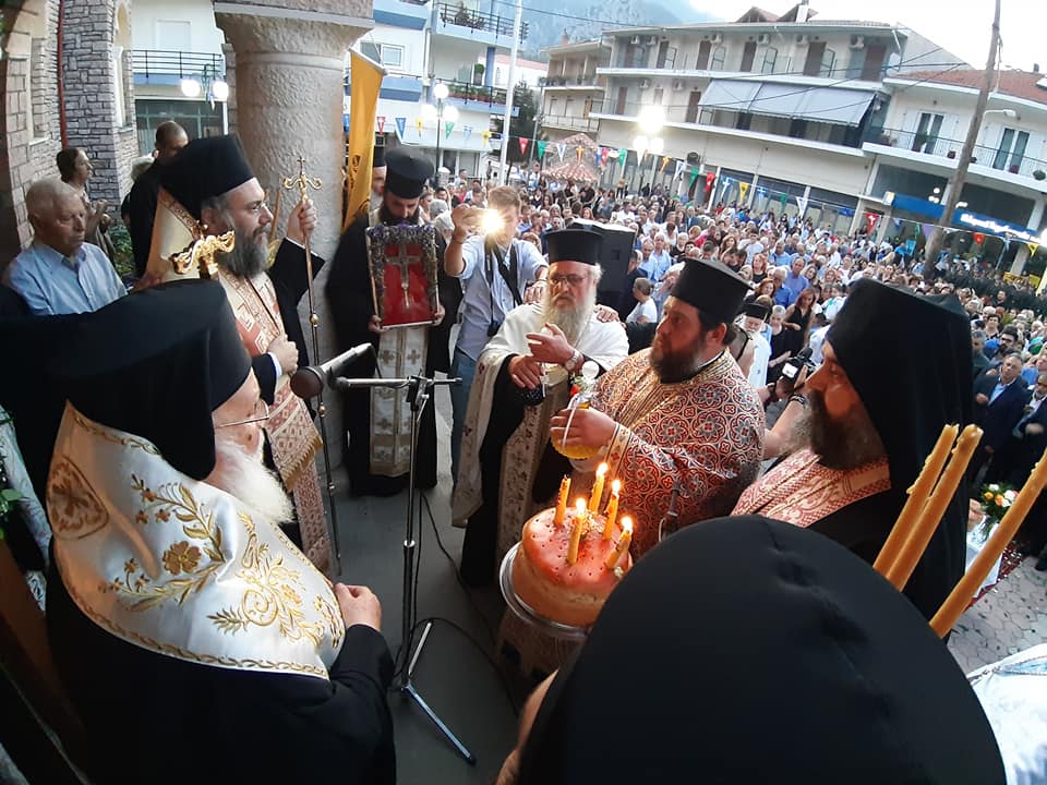 Όπως κατέγραψε το trikalavoice.gr Το απόγευμα έγινε δεκτή η Τιμία Κάρα του Αγίου εκ της Ιεράς Μονής Δουσίκου και αμέσως μετά αφίχθηκε το απότμημα το Τιμίου Ξύλου εκ της Αγίας πόλης των Ιεροσολύμων. Το κόμισε δε ο Μητροπολίτης Ναζαρέτ Κυριακός και έγινε δεκτό από κλήρο και λαό υπό του Ποιμενάρχου ημών κ. Χρυσοστόμου.