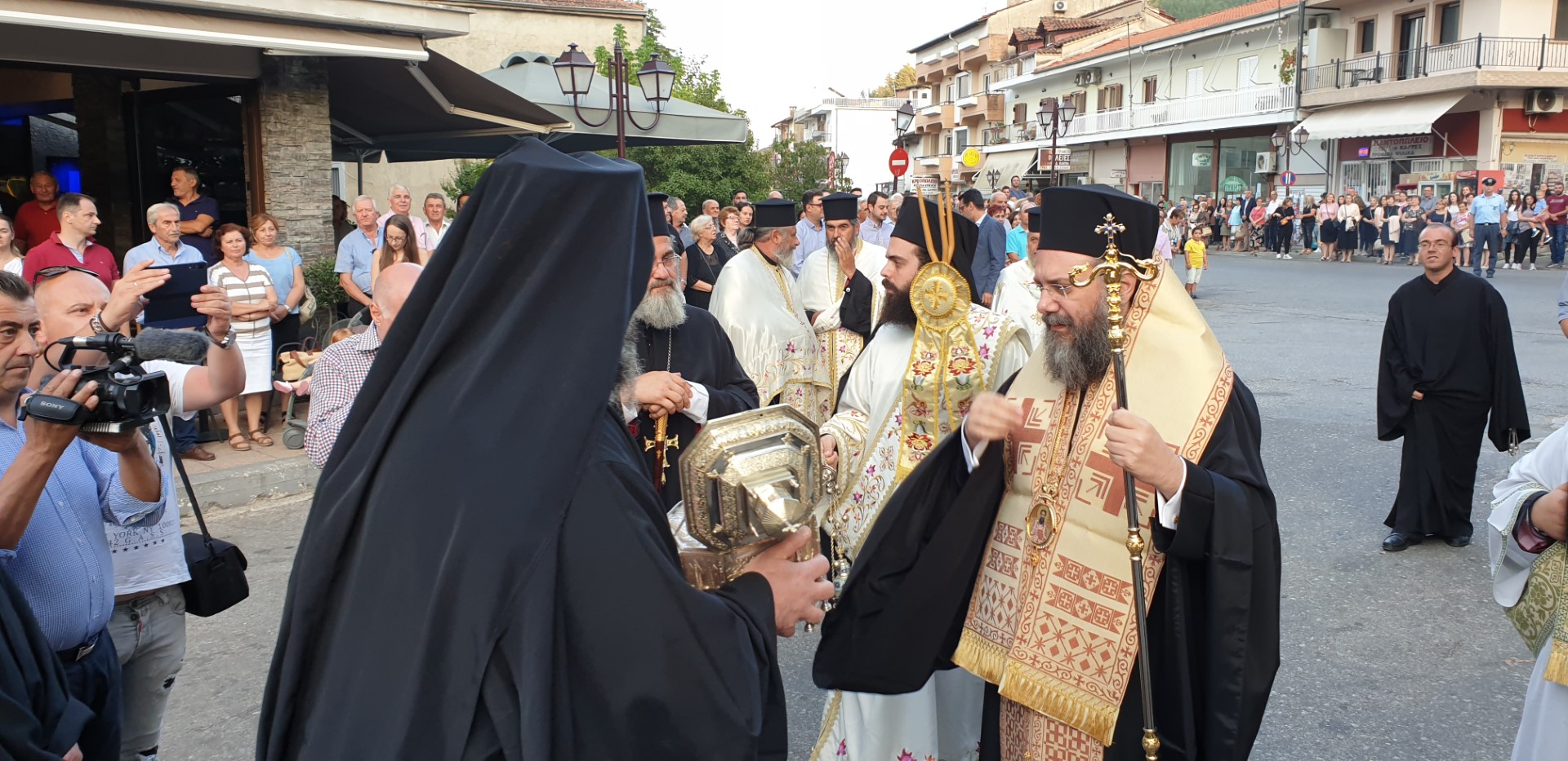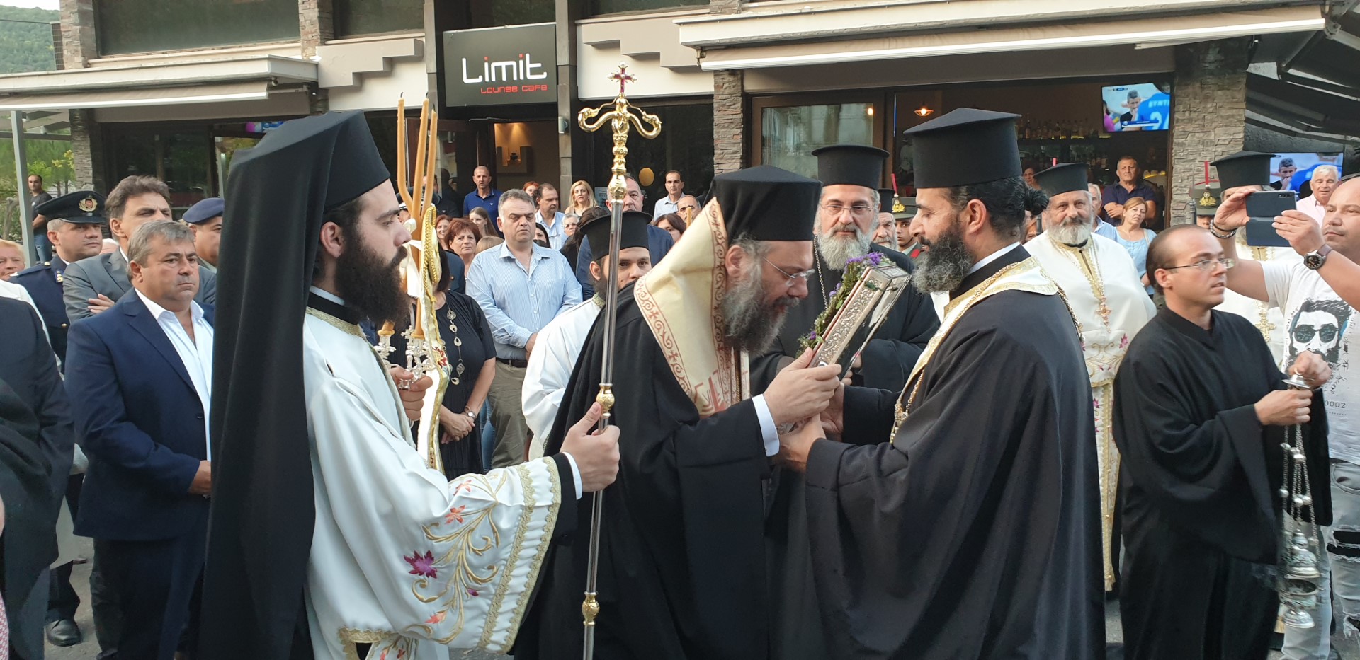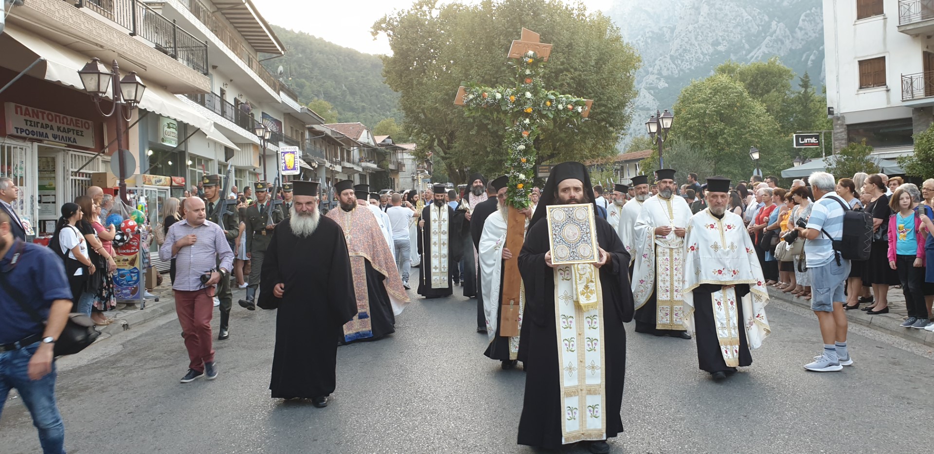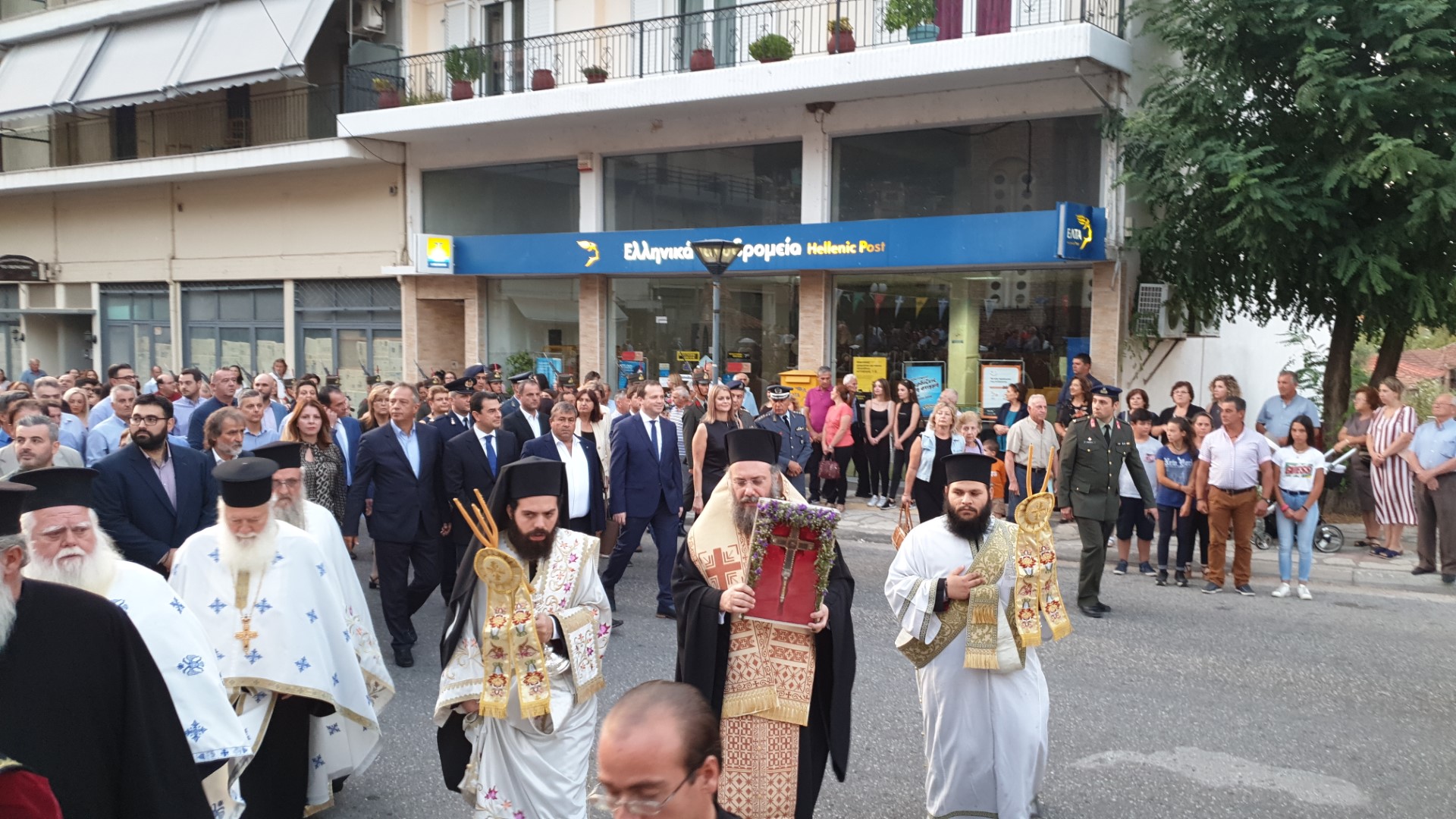 Όπως κατέγραψε το trikalavoice.gr Το απόγευμα έγινε δεκτή η Τιμία Κάρα του Αγίου εκ της Ιεράς Μονής Δουσίκου και αμέσως μετά αφίχθηκε το απότμημα το Τιμίου Ξύλου εκ της Αγίας πόλης των Ιεροσολύμων. Το κόμισε δε ο Μητροπολίτης Ναζαρέτ Κυριακός και έγινε δεκτό από κλήρο και λαό υπό του Ποιμενάρχου ημών κ. Χρυσοστόμου.