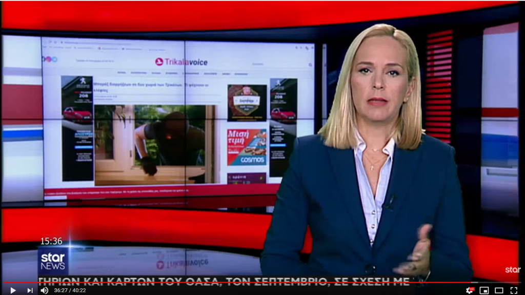 Σταθερή πηγή ειδήσεων για τα μεγάλα Αθηναϊκά δίκτυα το trikalavoice.gr. Και τη Δευτέρα ένα από τα θέματά μας-αυτό με τις διαρρήξεις σε Μεγαλοχώρι και Μεγάλα Καλύβια-έπαιξε ως πρώτο θέμα από την περιφέρεια στο απογευματινό δελτίο ειδήσεων του STAR Channel με την Τασούλα Παπανικολάου. Δείτε μετά το 36΄…