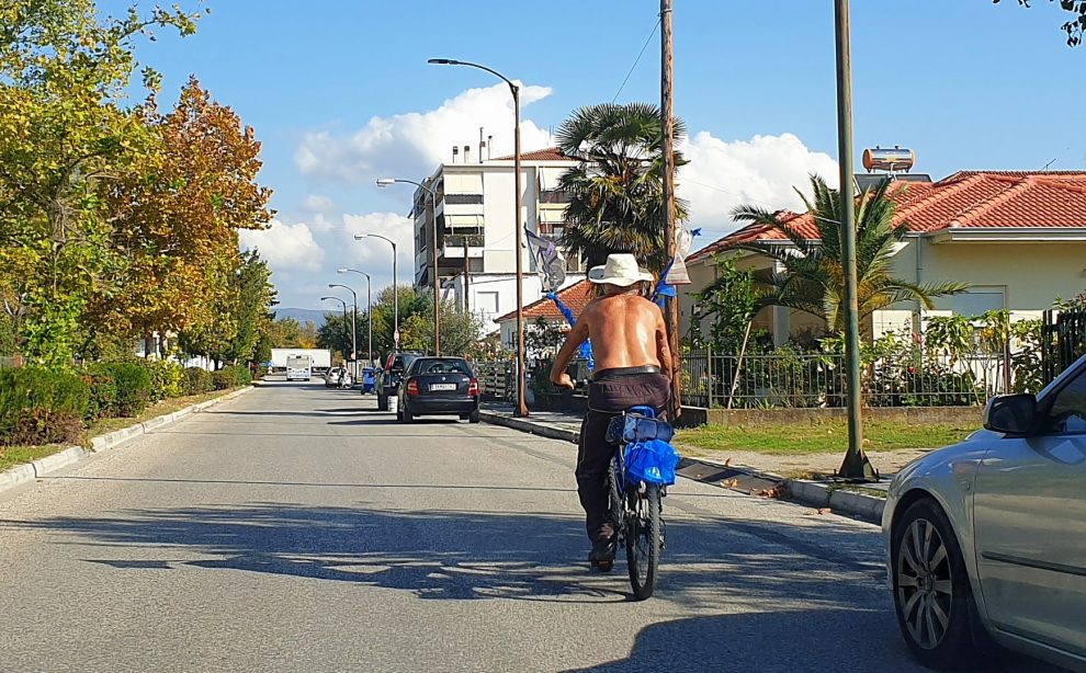 Ο ηλικιωμένος άντρας φορώντας μάσκα, αλλά όχι και μπλουζάκι, κρέμασε δυο σημαιάκια στο ποδήλατό του τα οποία ανέγραφαν «Ιησούς Χριστός Νικά» και ξεχύθηκε στην πόλη.
