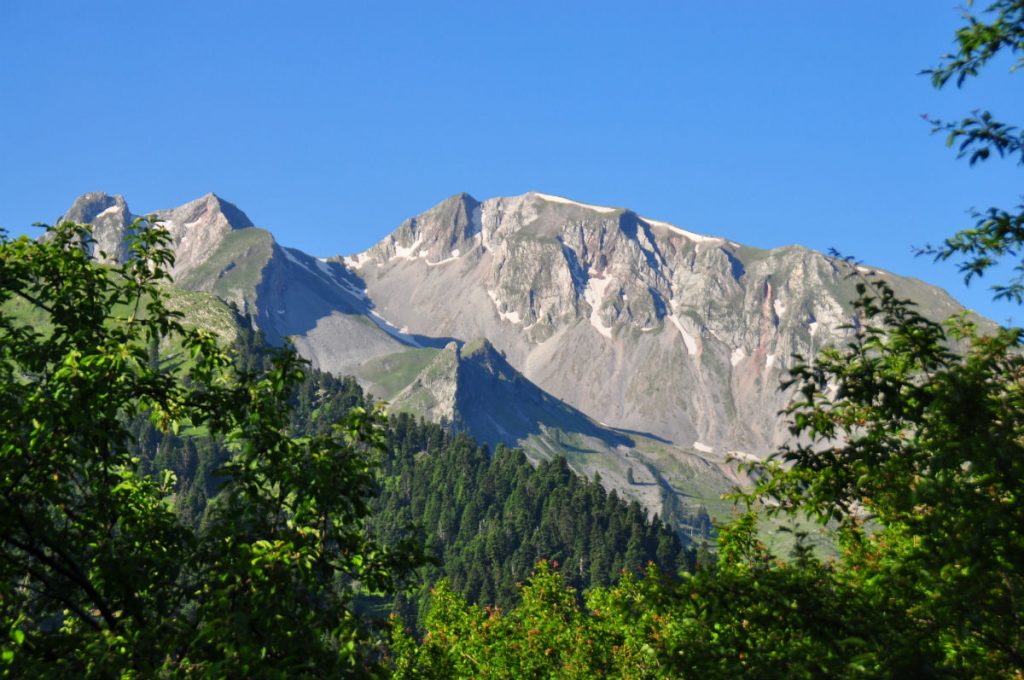 Κοιτάζοντας ανατολικά αντικρίζουμε την Τσούκα Σάκκα. Νότια υψώνονται οι κορυφές της Λιάκουρας και της πολυτραγουδισμένης φτέρης. Η κατεύθυνσή μας τώρα είναι η απότομη κάθοδος της σαθρής ράχης και για μια ολόκληρη ώρα κάθετης κατάβασης βγαίνουμε σε χαμηλή βλάστηση του κέδρου, του αγριόβατου και του θάμνου. Χαμηλότερα μέσα στο πυκνό διάβα σωροί τα ερείπια μερικών σπιτιών, με τις πεζούλες να συγκρατούν μερικά κέδρινα ξύλα απομεινάρια από τις ξυλοκατασκευές για συγκράτηση της κάθε σκεπής.