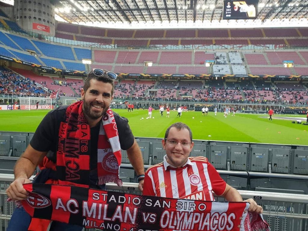 Το έκαναν το ταξίδι για να ‘ναι κοντά στην αγαπημένη τους ομάδας και έστω και αν πικράθηκαν παραμένουν… εκεί, μια ζωή Ολυμπιακός. Ο Γιώργος Καταβούτας διακρίνεται στη φωτό μέσα στο γήπεδο της θρυλικής Μίλαν, λίγο μετά το τέλος του ματς.