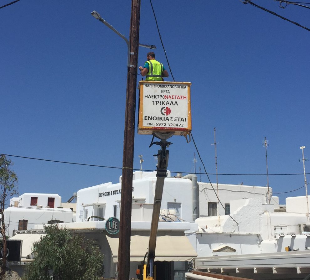 Όπως καταγράφει το trikalavoice.gr Τρικαλινή εταιρεία έχει αναλάβει την ευθύνη για την αλλαγή λαμπτήρων και υποστήριξη του έργου του Δήμου της Μυκόνου, όσον αφορά τα ηλεκτρολογικά έργα. Η φωτό παραπάνω είναι του φίλου μας Γιώργου Καρρά, ο οποίος επίσης δραστηριοποιείται στη Μύκονο αυτή τη περίοδο στο χώρο των συγκοινωνιών. Τρίκαλα παντού…
