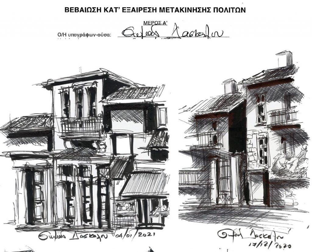 Όπως ο ίδιος λέει “συνεχίζω σε κάθε μου έξοδο να αποτυπώνω στο πίσω μέρος της «ΒΕΒΑΙΩΣΗΣ ΚΑΤ’ ΕΞΑΙΡΕΣΗ ΜΕΤΑΚΙΝΗΣΗΣ ΠΟΛΙΤΩΝ» διάφορες χαρακτηριστικές αρχιτεκτονικές γωνιές της όμορφης πόλεώς μας. Έχω μέχρι τώρα πάνω από 200 τέτοια στιγμιαία σκίτσα, τα οποία θα θυμίζουν αυτή την αποτρόπαια παγερή απαγορευτική περίοδο κατά την οποία χάσαμε το πρόσωπο του πλησίον μας”.