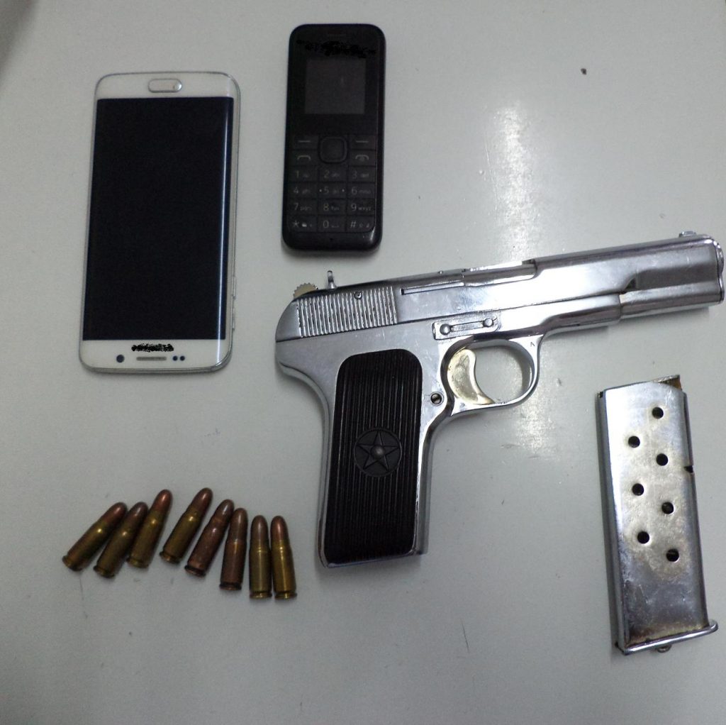 Σε έλεγχο που διενεργήθηκε στο όχημα, βρέθηκαν και κατασχέθηκαν ένα πυροβόλο όπλο (πιστόλι) με γεμιστήρα και οκτώ φυσίγγια, ένα αλεξίσφαιρο γιλέκο, καθώς και δύο κινητά τηλέφωνα.