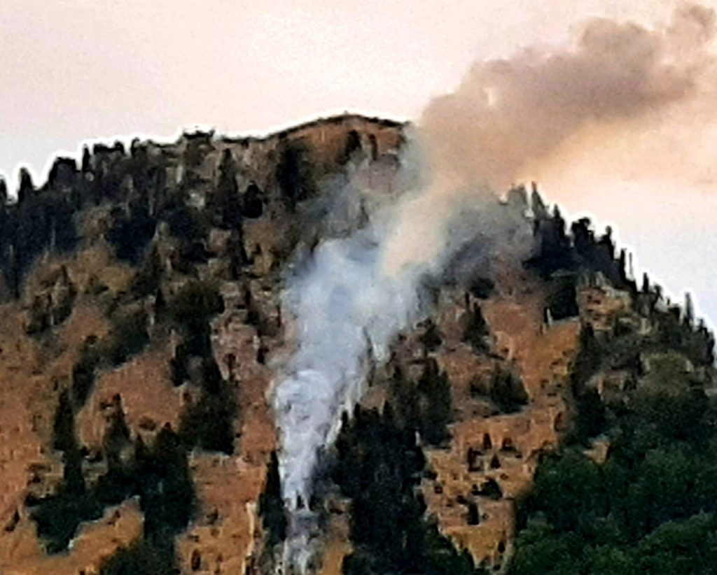 Όπως καταγράφει το trikalavoice.gr η φωτιά ξέσπασε μετά από πτώση κεραυνού το βράδυ της Δευτέρας. Κατακαίει έναν έλατο 20 μέτρων περίπου και ανά διαστήματα βγαίνουν φλόγες και καπνοί. Το σημείο είναι δυσπρόσιτο, σε απότομη πλαγιά και δεν είναι καν δυνατόν να κοπεί το δέντρο καθώς υπάρχει κίνδυνος να φύγουν τα “κάρβουνα” στην πλαγιά και να προκληθούν περισσότερα προβλήματα. Το σημείο προσέγγισαν το πρωί έξι πυροσβέστες οι οποίοι έλεγχαν την κατάσταση με ρίψεις χώματος. Οι καπνοί έχουν αραιώσει τις τελευταίες ώρες και όλα δείχνουν πως η περιπέτεια τελειώνει.