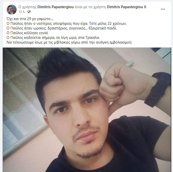 Φορτισμένη ανάρτηση Παπαστεργίου για το χαμό 29χρονου Τρικαλινού από covid-19