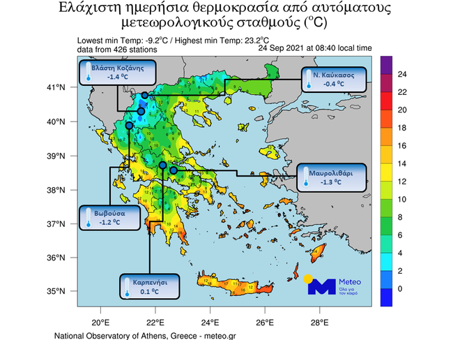 Στο χάρτη που ακολουθεί του meteo.gr παρουσιάζονται οι ελάχιστες θερμοκρασίες της Παρασκευής 24/09, όπως καταγράφονται από το δίκτυο αυτόματων μετεωρολογικών σταθμών του Εθνικού Αστεροσκοπείου Αθηνών / meteo.gr, ενώ αναφέρονται ενδεικτικά οι τιμές σε 5 περιοχές. Όπως σημειώνεται στο Χάρτη, παγετός σημειώθηκε στη Δυτική Μακεδονία και στην Ήπειρο, με τη θερμοκρασία στη Βλάστη Κοζάνης να πέφτει στους -1,4 ⁰C, ενώ η χαμηλότερη ελάχιστη θερμοκρασία του δικτύου καταγράφτηκε στη δολίνη του Βαθύσταλου Παρνασσού με -9.2 ⁰C. Στα Τρίκαλα η χαμηλότερη θερμοκρασία που καταγράφηκε ήταν 6 ⁰C.