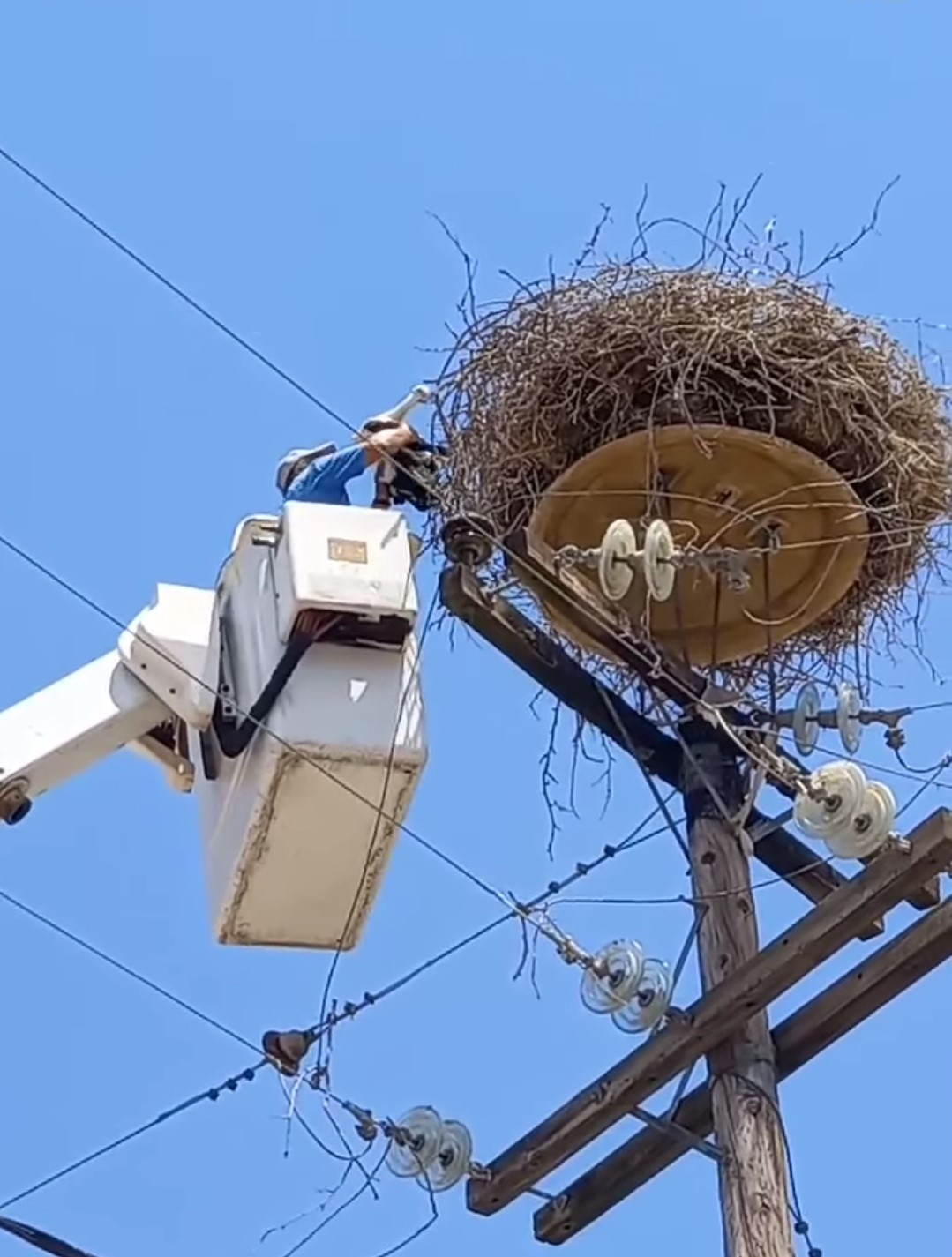 Αμεσα ενημερώθηκε η Υπηρεσία Πρασίνου, που ειδοποίησε και τον ΔΕΔΗΕ, καθώς αμφότερες οι υπηρεσίες διαθέτουν οχήματα με σκάλες για μεγάλο ύψος. Ο προϊστάμενος της Υπηρεσίας του Δήμου, Σωτήρης Χελιδώνης συνεργάστηκε με τον πρόεδρο ενός άλλου χωριού του Δήμου Τρικκαίων, τον Γιάννη Παπαχρήστο της Ράξας, ο οποίος εργάζεται για τον ΔΕΔΗΕ και ήταν αυτός που τοποθέτησε τον νεοσσό ξανά στη φωλιά του, στην κολώνα της ΔΕΗ, δίπλα στο αδελφάκι του.