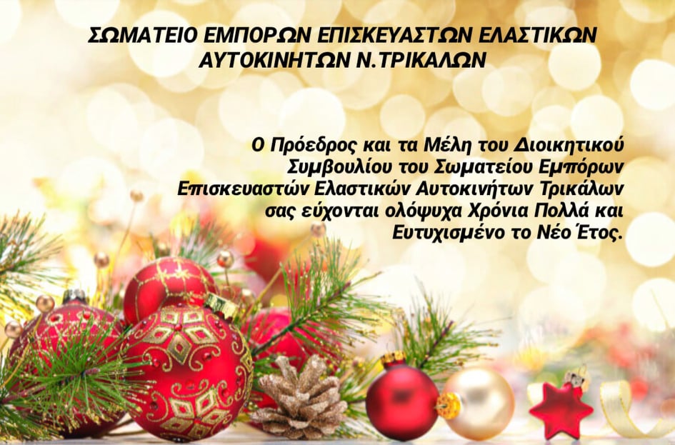 Χριστουγεννιάτικες ευχές στέλνει το Σωματείο Επισκευαστών Ελαστικών αυτοκινήτων Τρικάλων.