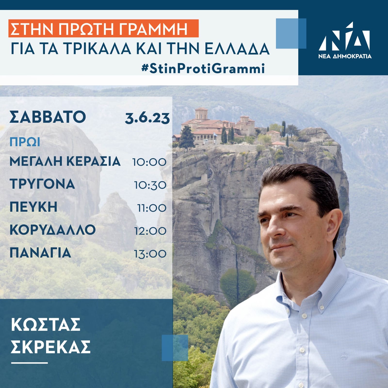 Με αμείωτους ρυθμούς συνεχίζει τις επισκέψεις του στα χωριά του Νομού Τρικάλων ο Κώστας Σκρέκας για να φτάσει παντού το μήνυμα για μια ισχυρή Κυβέρνηση με Νέα Δημοκρατία και Πρωθυπουργό τον Κυριάκο Μητσοτάκη.