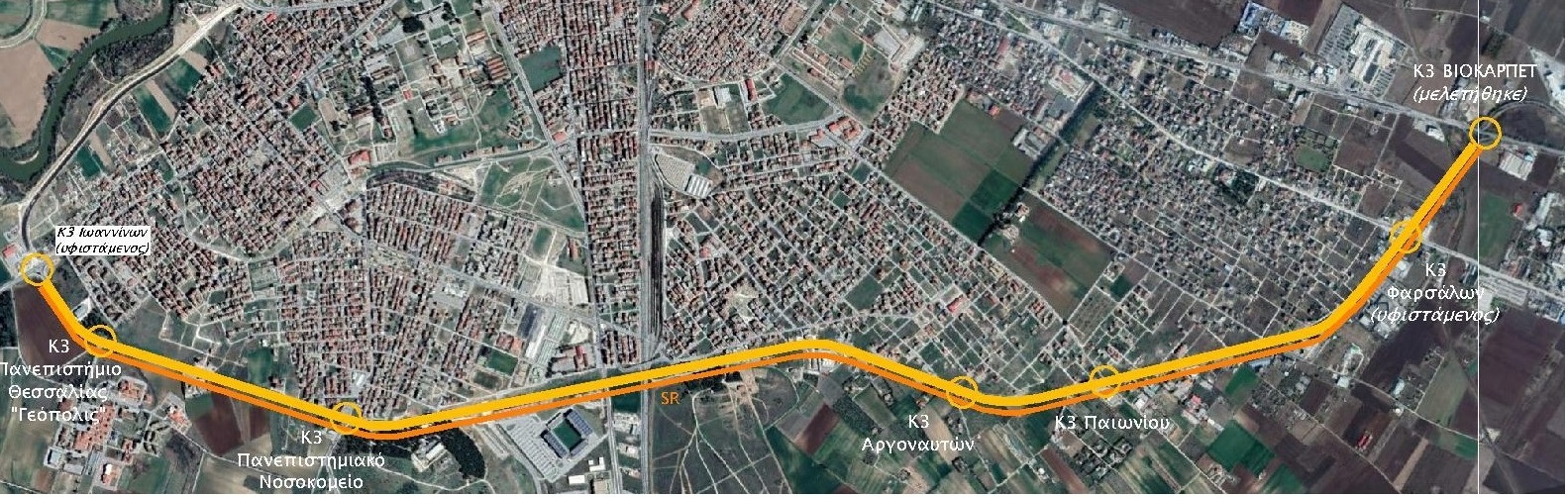 - Ι/Κ της Νότιας Παράκαμψης Λάρισας με την οδό για Πανεπιστημιακό Νοσοκομείο