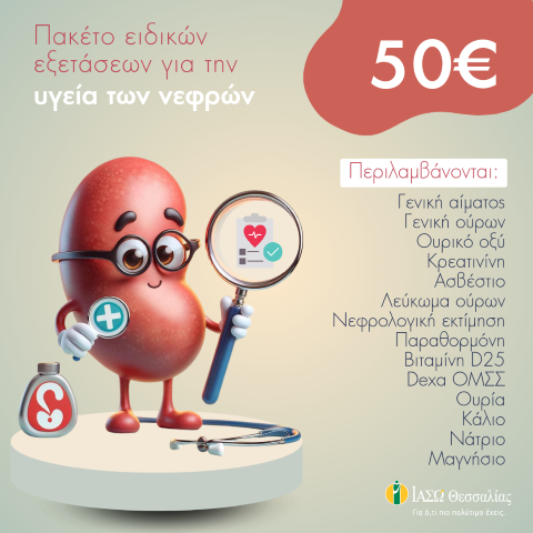 Με αφορμή την Παγκόσμια Ημέρα Νεφρού, που φέτος γιορτάζεται στις 14 Μαρτίου, το ΙΑΣΩ Θεσσαλίας προσφέρει πακέτο εξετάσεων που περιλαμβάνει: