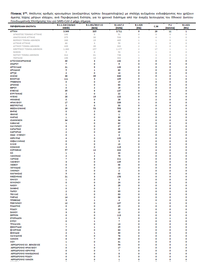 Μεταξύ των 28.209 τυχαία επιλεγμένων δειγμάτων στην επικράτεια, τα τέσσερα πιο συχνά στελέχη ειδικού ενδιαφέροντος ή υπό παρακολούθηση που έχουν απομονωθεί είναι το Alpha, με ποσοστό 55,16%, ακολουθούμενο από το Delta με ποσοστό 27,73%, το B.1.1.318 (Variant E484K) με ποσοστό 8,31%, και το Beta με ποσοστό 1,17%.