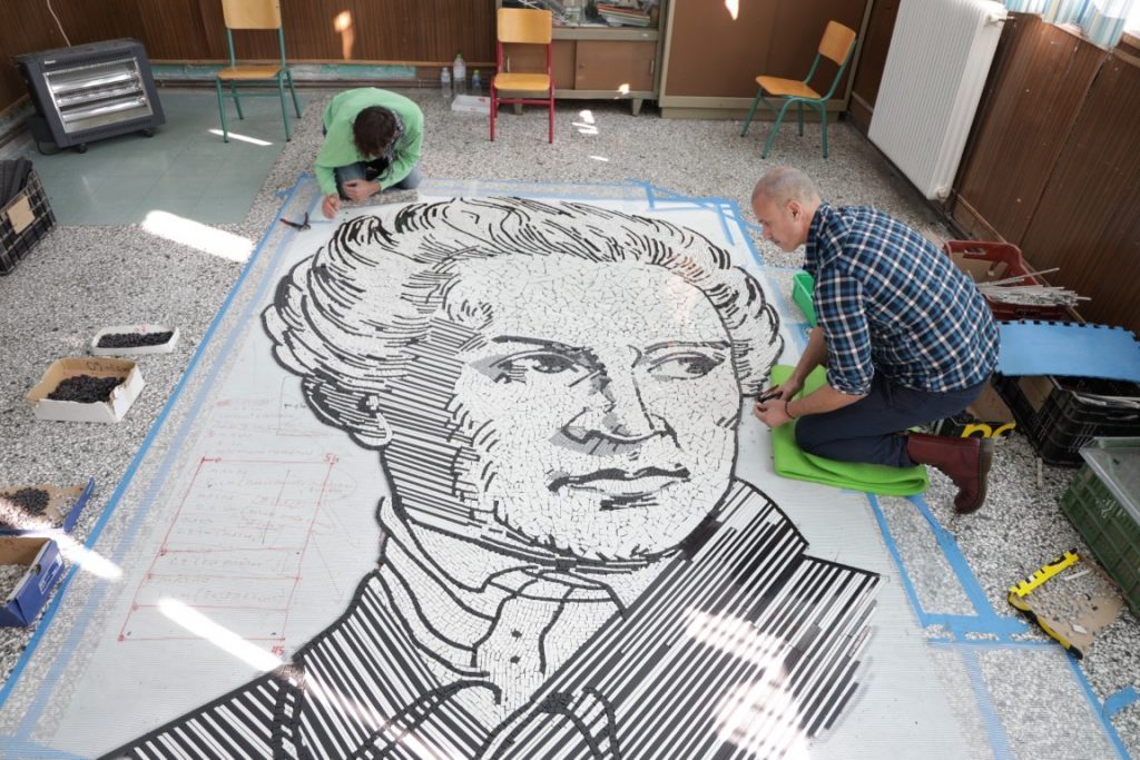 Με πρωτοβουλία του Συλλόγου Γονέων και Κηδεμόνων του 5ου Δημοτικού Σχολείου Τρικάλων, το οποίο μετονομάστηκε σε “Διονύσιος Σολωμός” προ λίγων ετών, και σε συνεργασία με το Δήμο Τρικκαίων αποφασίστηκε η προσωπογραφία του εθνικού μας ποιητή να κοσμήσει τους τοίχους του σχολείου. Το έργο ανέλαβαν να φέρουν εις πέρας οι Γιώργος Κουρμέτζας και Μιχάλης Κουφογιάννης, δημιουργοί του μεγαλύτερου ψηφιδωτού ως τώρα στην Ελλάδα, της προσωπογραφίας του Βασίλη Τσιτσάνη.
