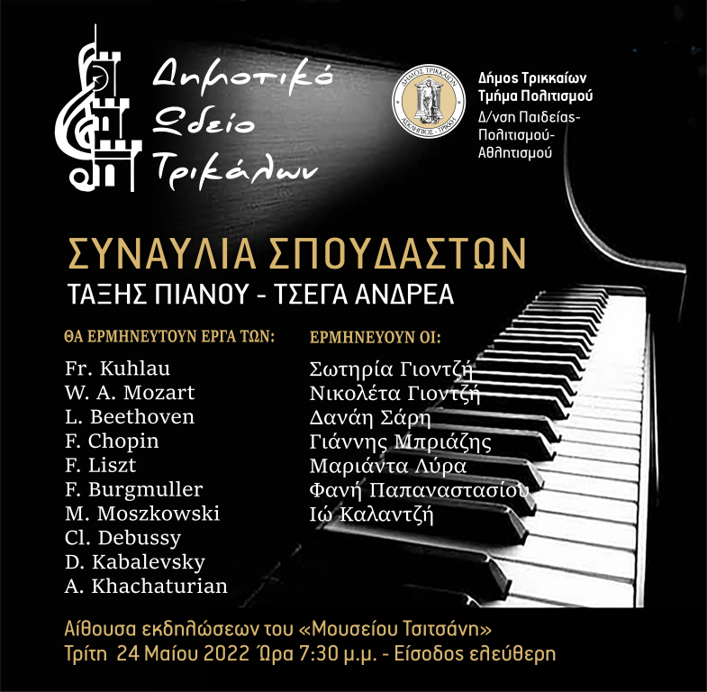 Με δύο συναυλίες αποχαιρετά τον Μάιο το Δημοτικό Ωδείο Τρικάλων. Η πρώτη, την ερχόμενη Τρίτη 24 Μαΐου 2022 στις 19:30, στην αίθουσα εκδηλώσεων του μουσείου Τσιτσάνη. Πρόκειται για «Συναυλία Σπουδαστών» της τάξης πιάνου του καθηγητή του ΔΩΤ κ. Ανδρέα Τσέγα . Το μουσικόφιλο κοινό θα έχει την ευκαιρία να απολαύσει έργα μεγάλων συνθετών όπως Kuhlau, Burgmuller, Kabalevsky, Mozart ,Beethoven, Chopin, Debussy, Liszt, Moszkowski, Chatschaturjan.