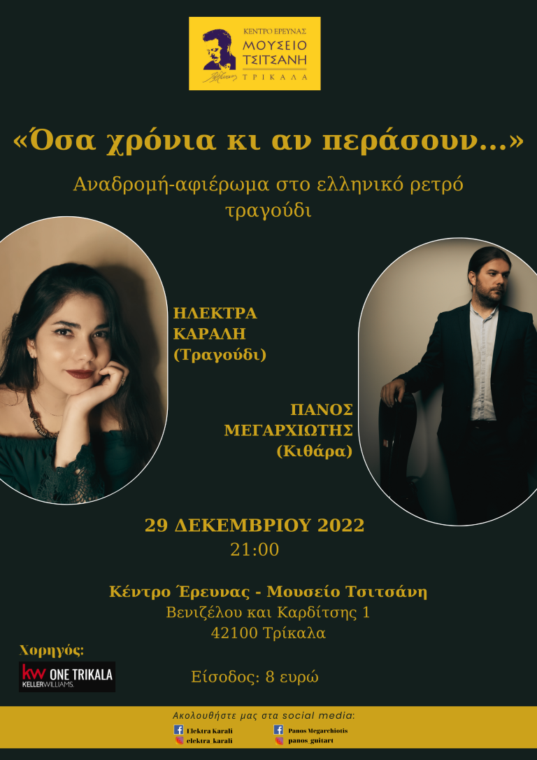 Την Πέμπτη 29 Δεκεμβρίου στις 20:30 στο Μουσείο Τσιτσάνη θα πραγματοποιηθεί συναυλία – αφιέρωμα στο ελληνικό ρετρό τραγούδι. Μια ρομαντική μουσική βόλτα στο πρώτο μισό του 20ου αι. με την φωνή της Ηλέκτρας Καράλη και την κιθάρα του Πάνου Μεγαρχιώτη. Το ρεπερτόριο περιλαμβάνει ρετρό τραγούδια που έγιναν μεγάλες επιτυχίες καθώς και άλλα που δεν ακούστηκαν αρκετά. Όλα τους όμως μικρά διαμάντια με πλούσιες ενορχηστρώσεις, εμπνευσμένα από την καθημερινή ζωή και από ιστορίες αγάπης που ακόμα κι αν κάποιες στο τέλος αποδείχτηκαν ολέθριες, η αξιοπρέπεια και ο σεβασμός δεν χάθηκαν. Θα παιχτούν κομμάτια συνθετών όπως Αττίκ, Μ. Κατριβάνος, Γ. Βέλλας, Χ. Χαιρόπουλος, Κ. Γιαννίδης κ. α.