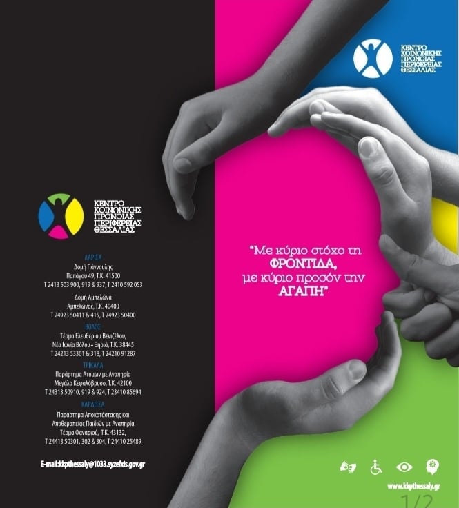 Μπορεί να καταφέρνεις να χρησιμοποιείς με επιτυχία τα χέρια σου …μπορεί και όχι… Μπορεί να καταφέρνεις να απολαμβάνεις τη χρησιμότητα όλων των αισθήσεων…μπορεί και όχι… Σίγουρα όμως αντιλαμβάνεσαι την αγάπη, τη χαρά, την αποδοχή, την αρμονική συνύπαρξη, τη δημιουργική απασχόληση. Αντιλαμβάνεσαι το χαμόγελο και την αγκαλιά. Και εμείς είμαστε εδώ για να στα χαρίσουμε απλόχερα από ψυχής… Κέντρο Κοινωνικής Πρόνοιας Θεσσαλίας Για εμάς το “πρόβλημα” είναι “πρόκληση”, είναι “λύση”, είναι “Ζωή”…