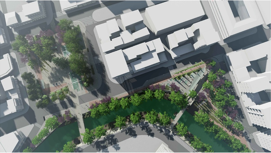 Η περιοχή προς την πλευρά του Ληθαίου ποταμού, που συνδέει τις δύο πλατείες, διαμορφώνεται με δύο τύπους χυτού έγχρωμου επεξεργασμένου σκυροδέματος, περιλαμβάνει ζώνη όδευσης τυφλών όπως και ποδηλατόδρομο και οδηγεί στην πλατεία Εθνικής Αντίστασης.