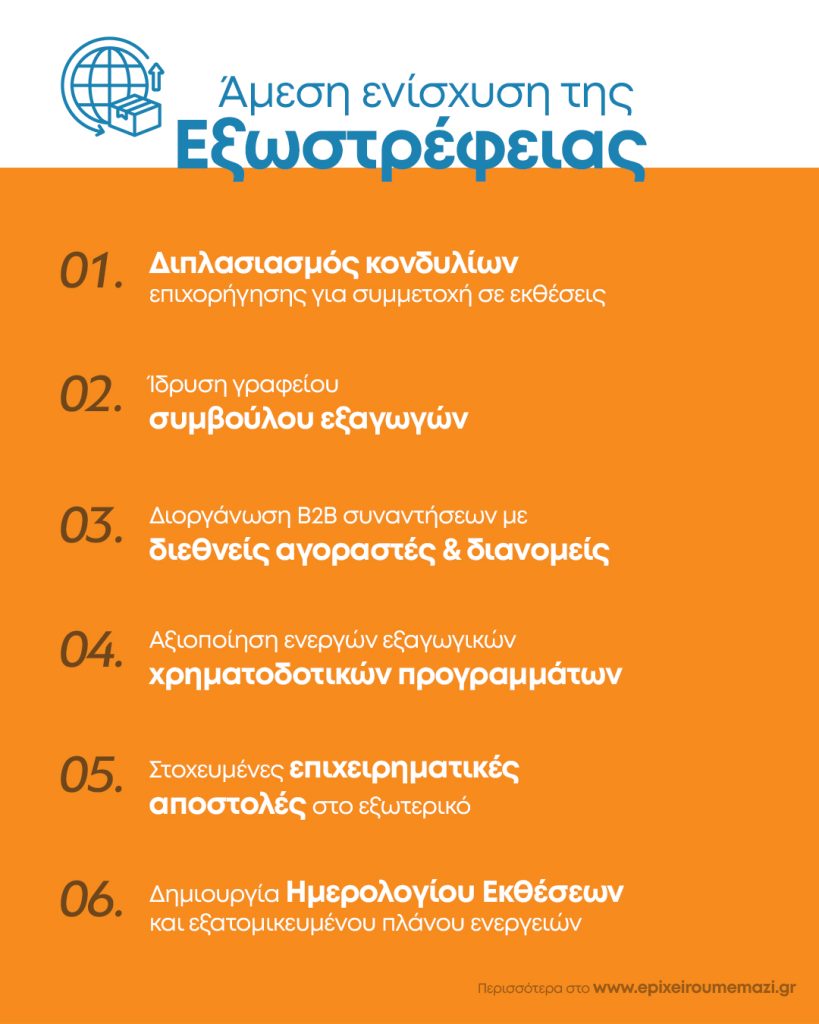 - Δημιουργία Ημερολογίου Εκθέσεων: Καθιέρωση ετήσιου πλάνου εκθέσεων όπου οι επιχειρήσεις θα μπορούν να βρίσκουν συγκεντρωμένες όλες τις σημαντικές εκθέσεις ανά κλάδο. Το πλάνο αυτό θα περιλαμβάνει και στοχευμένες προτάσεις για τις εκθέσεις που ταιριάζουν καλύτερα στις ανάγκες κάθε επιχείρησης, στοχεύοντας στη μέγιστη απόδοση της συμμετοχής τους.