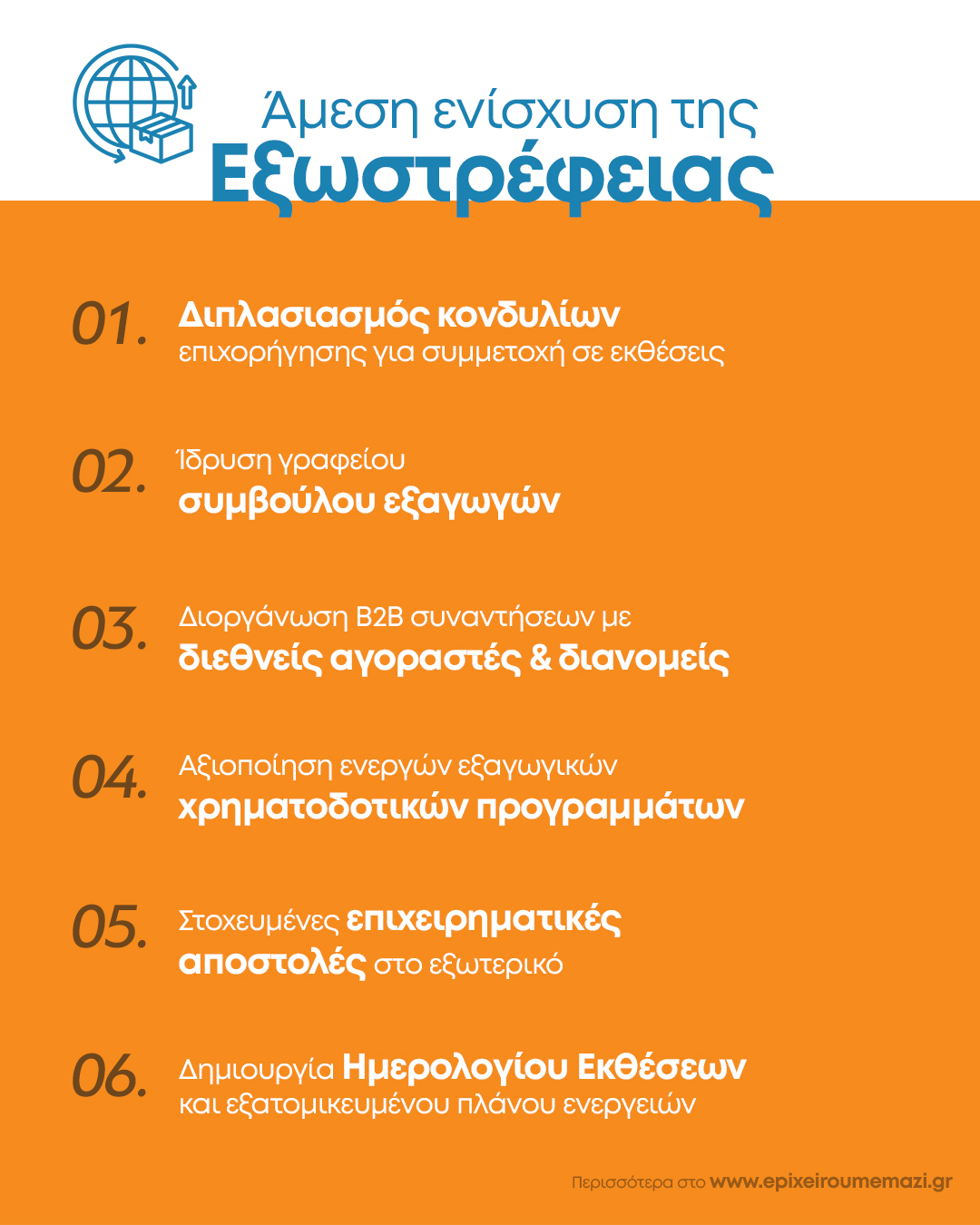 - Χρηματοδοτικά προγράμματα εξαγωγών: Αξιοποίηση ενεργών χρηματοδοτικών προγραμμάτων, τόσο εθνικών όσο και ευρωπαϊκών, που θα υποστηρίζουν τις εξαγωγικές δραστηριότητες των τοπικών επιχειρήσεων. Στόχος είναι να διασφαλιστεί ότι οι επιχειρήσεις της περιοχής έχουν πρόσβαση σε χρηματοδοτικά εργαλεία για να ενισχύσουν την εξωστρέφειά τους και να αποκτήσουν δυναμική παρουσία σε διεθνείς αγορές.