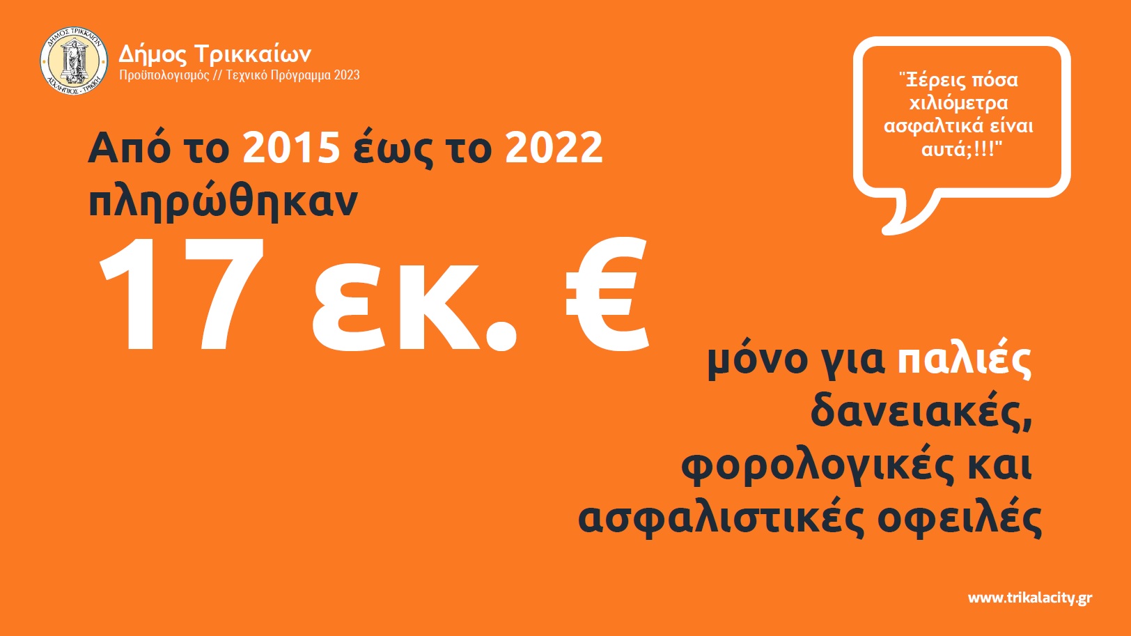Ως παράδειγμα και ως αντιπαραβολή για τη θετική οικονομική πορεία του Δήμου, ο κ. Παπαστεργίου αναφέρθηκε σε 17 εκ. €: αυτά δόθηκαν σε αποπληρωμή δανείων από  το 2015 και μετά, με τον Δήμαρχο να αναρωτιέται, σε πόσα χιλιόμετρα ασφαλτόστρωσης αντιστοιχούν.