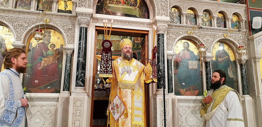 Ο Μητροπολίτης Τρίκκης και Σταγών χοροστάτησε του Όρθρου και ενεδύθηκε των Αρχιερατικών Αμφίων έμπροσθεν του Ιερού Βήματος.