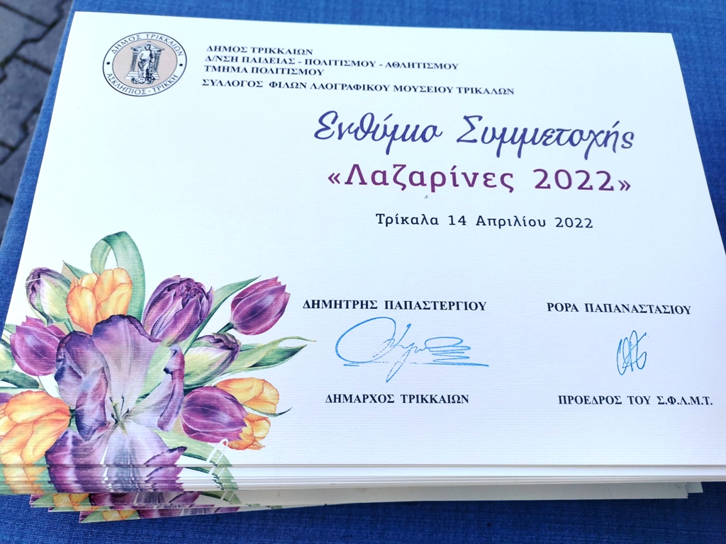 Τα λουλούδια, οι ανθοσυνθέσεις, η περιποίηση και η ευρηματικότητα στα καλάθια, τα λαζαριανά τραγούδια και μάλιστα με τοπικές παραλλαγές, οι παραδοσιακές ενδυμασίες, η φροντίδα, το μεράκι, η προσοχή που επέδειξαν τα μικρά κορίτσια, οι μητέρες και κηδεμόνισσες, οι γιαγιάδες τους, αποτέλεσαν τη σύνθεση μιας γιορτής. Αυτή η γιορτή διεξήχθη το πρωί της Πέμπτης 14 Απριλίου 2022, στον ανοιχτό χώρο μπροστά από το Πνευματικό Κέντρο Δήμου Τρικκαίων «Αθανάσιος Τριγώνης». Η προεργασία και η διοργάνωση του διαγωνισμού ανήκε στο τμήμα Πολιτισμού της Δ/νσης Παιδείας, Πολιτισμού & Αθλητισμού του Δ. Τρικκαίων. Η κριτική επιτροπή, που άκουσε, είδε και αξιολόγησε όλες τις συμμετοχές, αποτελούταν από τηνα ντιδήαμρχο Παιδείας, Πολιτισμού, Αθλητισμού & Δημοσίων Σχέσεων του Δ. Τρικκαίων Εφη Λεβέντη, την πρόεδρο του Δημοτικού Θεάτρου Τρικάλων Σοφία Αλεστά, τη δημοτική σύμβουλο Παρασκευή Βότσιου – Μακρή, τις εκπροσώπους του ΔΣ του Συλλόγου Φίλων Λαογραφικού Μουσείου Τρικάλων κ. Αρετή Αναγνωστιάδου – Μωράκη, Ρόρα Παπαναστασίου (πρόεδρος), Λίτσα Τσιρέπα και την εκπρόσωπο της Δ/νσης Πρωτοβάθμιας Εκπαίδευσης Τρικάλων κ. Αθανασία Γκίκα.