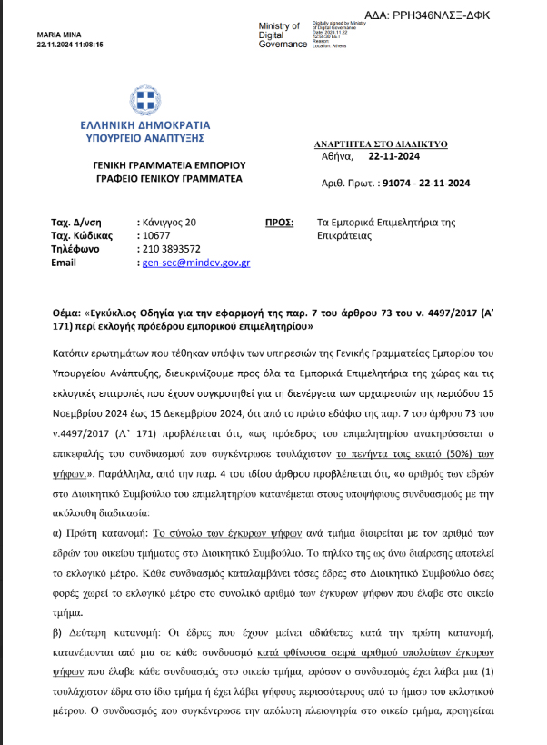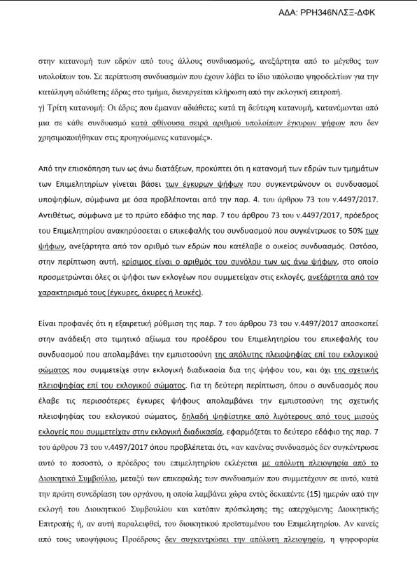 «… Από την επισκόπηση των ως άνω διατάξεων, προκύπτει ότι η κατανομή των εδρών των τμημάτων των Επιμελητηρίων γίνεται βάσει των έγκυρων ψήφων που συγκεντρώνουν οι συνδυασμοί υποψηφίων, σύμφωνα με όσα προβλέπονται από την παρ. 4. του άρθρου 73 του ν.4497/2017. Αντιθέτως, σύμφωνα με το πρώτο εδάφιο της παρ. 7 του άρθρου 73 του ν.4497/2017, πρόεδρος του Επιμελητηρίου ανακηρύσσεται ο επικεφαλής του συνδυασμού που συγκέντρωσε το 50% των ψήφων, ανεξάρτητα από τον αριθμό των εδρών που κατέλαβε ο οικείος συνδυασμός. Ωστόσο, στην περίπτωση αυτή, κρίσιμος είναι ο αριθμός του συνόλου των ως άνω ψήφων, στο οποίο προσμετρώνται όλες οι ψήφοι των εκλογέων που συμμετείχαν στις εκλογές, ανεξάρτητα από τον χαρακτηρισμό τους (έγκυρες, άκυρες ή λευκές).