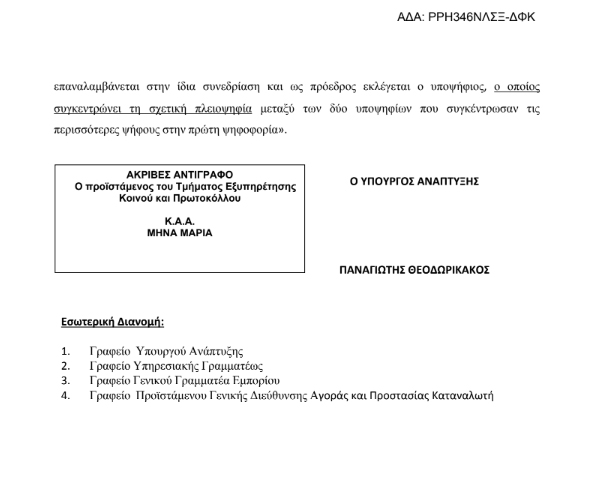 Συγκεκριμένα και όπως αποκαλύπτει το trikalavoice.gr με εγκύκλιό του θέτει νέες παραμέτρους για την εκλογή προέδρου και δίνει κατευθύνσεις στις εκλογικές επιτροπές. Το θέμα περιπλέκεται έτι περισσότερο για την περίπτωση του Επιμελητηρίου Τρικάλων καθώς η Εκλογική Επιτροπή έχει ήδη ανακηρύξει νικητή τον Κωνσταντίνο Παπαευθυμίου, έναντι του Βασίλη Γιαγιάκου (σ.σ. με 7 επιπλέον ψήφους μετά και την επανακαταμέτρηση) και πρόεδρο του νέου Δ.Σ..