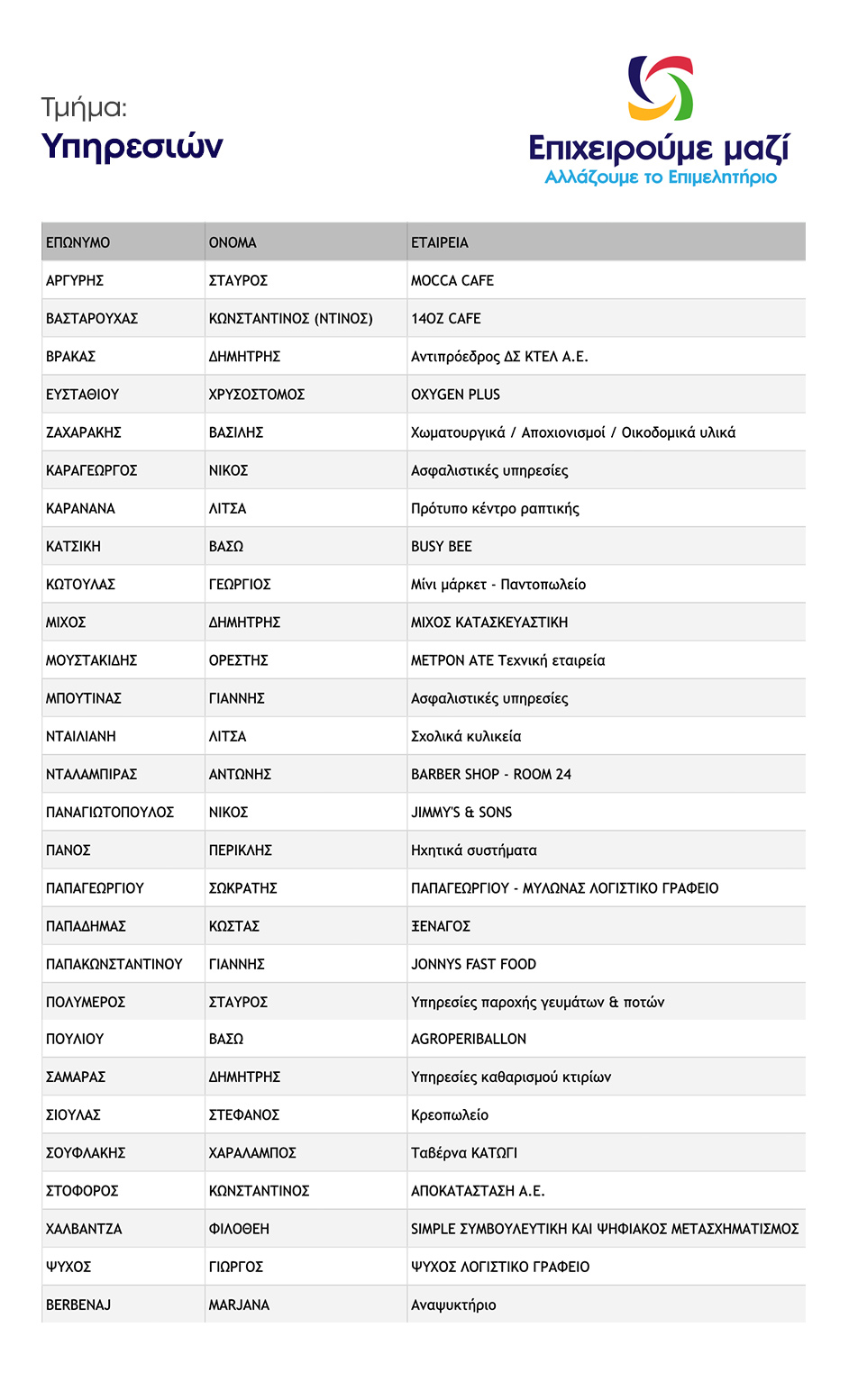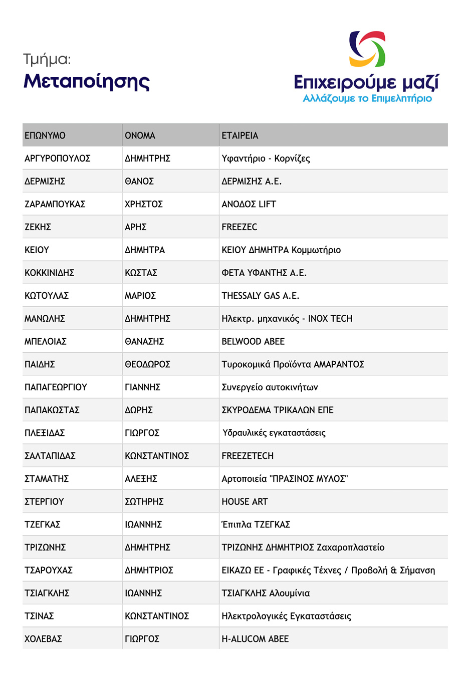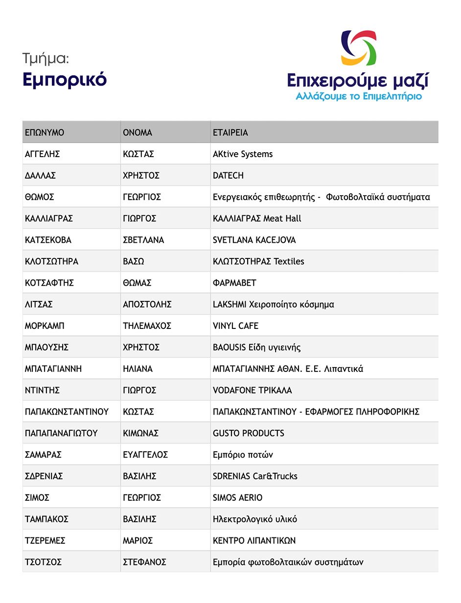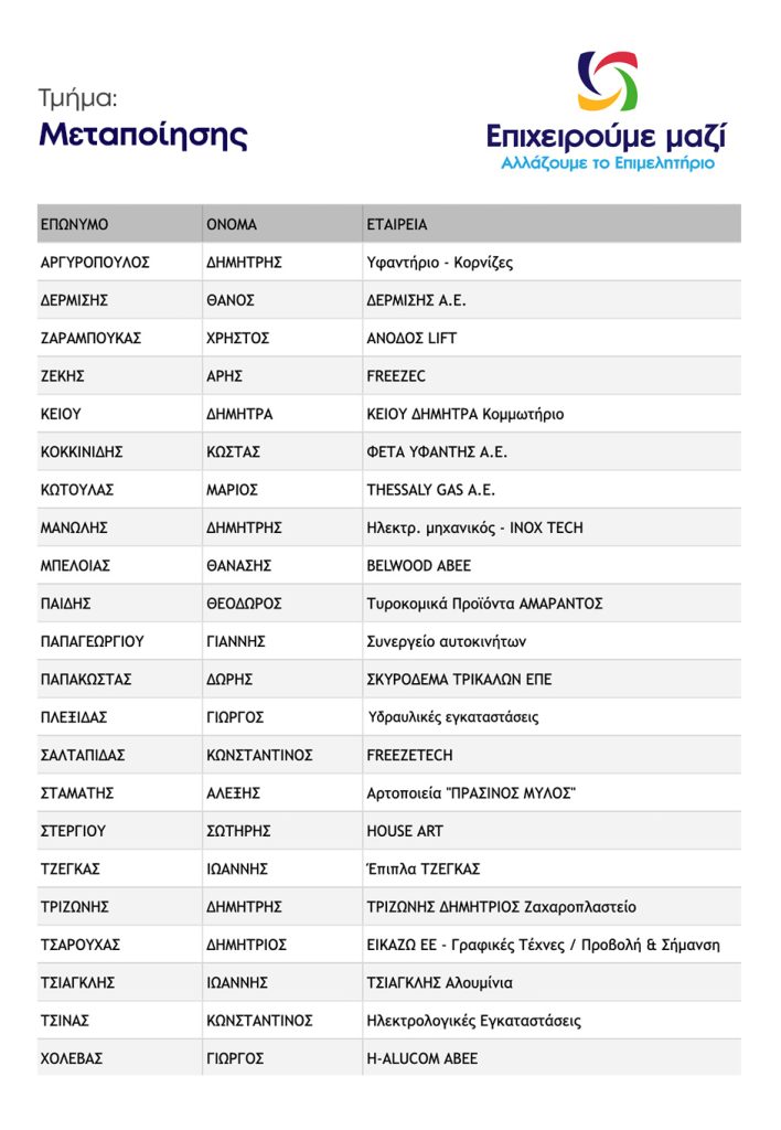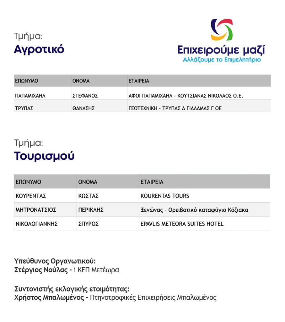 Στον συνδυασμό «Επιχειρούμε μαζί, Αλλάζουμε το επιμελητήριο» συμμετέχουν νέα πρόσωπα, επιχειρηματίες πρότυπα στο χώρο τους, με ακαδημαϊκό και επαγγελματικό υπόβαθρο. Συναντούν έμπειρους ανθρώπους με σημαντική παρουσία τόσο στα του Επιμελητηρίου όσο και στα κοινά. Όλοι μαζί, χωρίς αντιπαλότητες, χωρίς αφορισμούς, χωρίς κραυγές επιδιώκουν την αλλαγή σελίδας στη διοίκηση του Επιμελητηρίου Τρικάλων έπειτα από 21 ολόκληρα χρόνια.