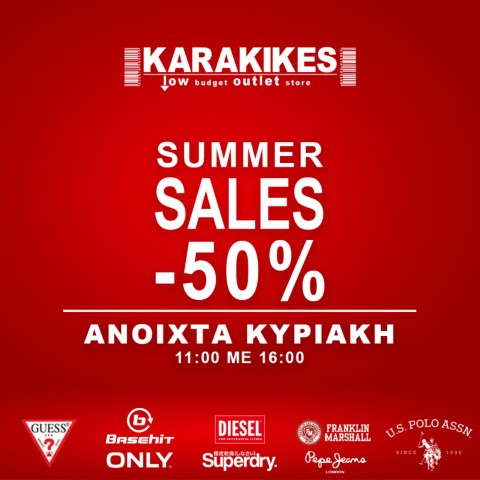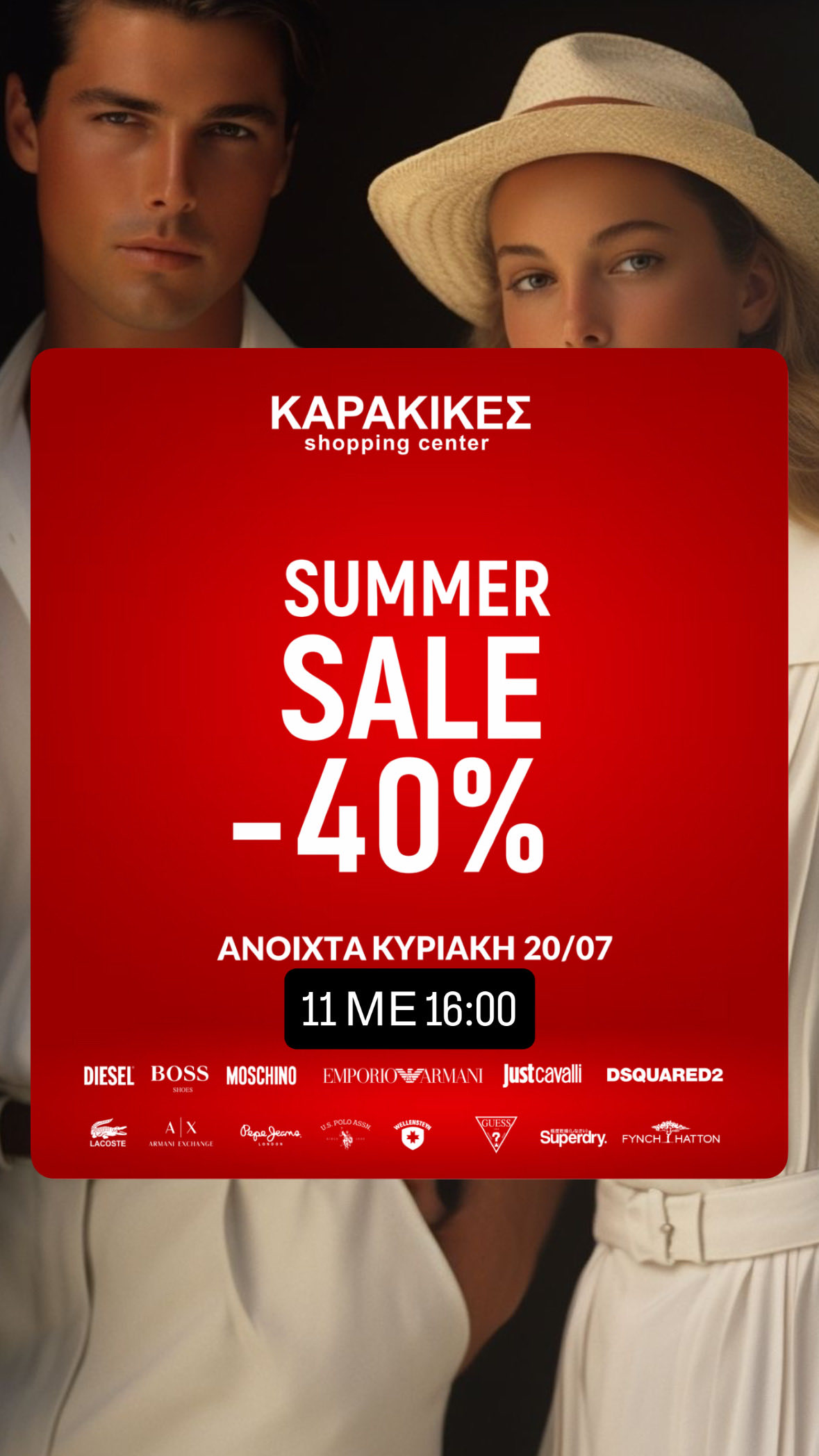 ΔΥΝΑΤΕΣ ΕΚΠΤΩΣΕΙΣ ΜΕ – 40%. ΑΝΟΙΧΤΑ ΑΥΤΗΝ ΤΗΝ ΚΥΡΙΑΚΗ 20/7 11-16:00. ΤΑ ΚΑΤΑΣΤΗΜΑΤΑ ΚΑΡΑΚΙΚΕΣ ΣΤΗΝ ΠΟΛΗ ΜΑΣ.