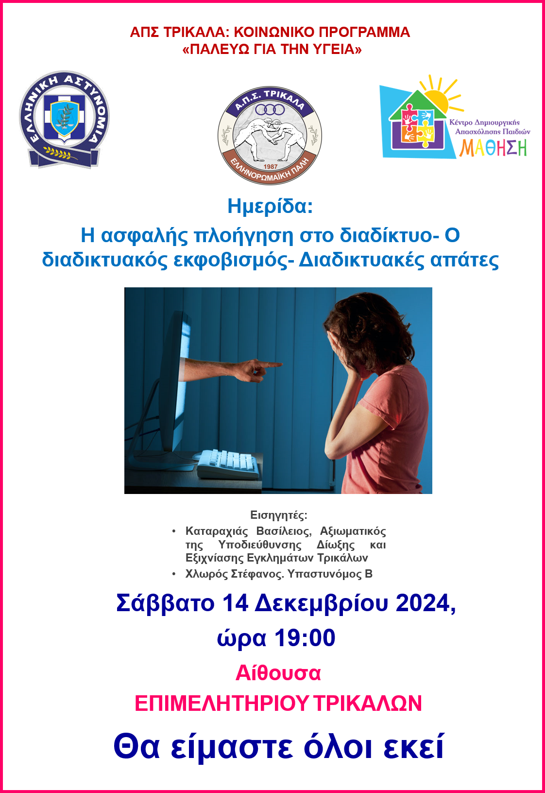 Ο ΑΠΣ ΤΡΙΚΑΛΑ, στα πλαίσια του κοινωνικού προγράμματός μας ΠΑΛΕΥΟΥΜΕ ΓΙΑ ΤΗΝ ΥΓΕΙΑ, η ΕΛΛΗΝΙΚΗ ΑΣΤΥΝΟΜΙΑ και τα ΚΔΑΠ ΜΑΘΗΣΗ συνδιοργανώνουν το Σάββατο 14 Δεκεμβρίου 2024 και ώρα 19:00 στην αίθουσα του Επιμελητηρίου Τρικάλων, Ημερίδα με θέμα: «Η ασφαλής πλοήγηση στο διαδίκτυο- Ο διαδικτυακός εκφοβισμός- Διαδικτυακές απάτες».