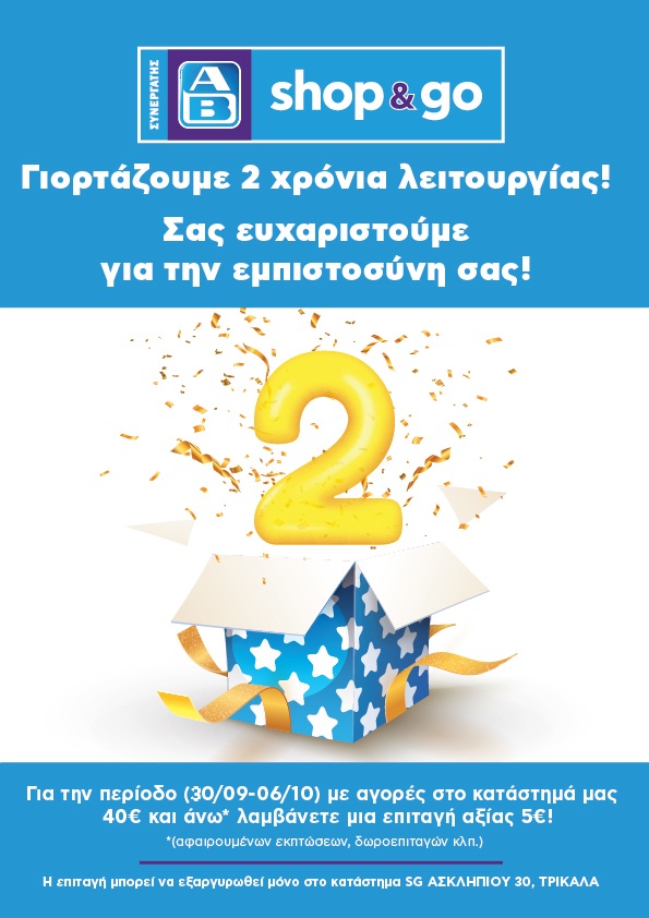 Το κατάστημα μας ΑΒ Shop & Go γιορτάζει 2 χρόνια λειτουργίας και θέλουμε να το γιορτάσουμε μαζί σας με μια μοναδική προσφορά!