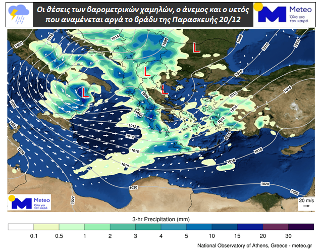 Μεταβολή παρουσιάζει ο καιρός από το μεσημέρι της Παρασκευής 20/12. Βαρομετρικό χαμηλό, κινούμενο ανατολικά θα επηρεάσει τον καιρό της χώρας έως και το Σαββάτο 21/12. Σύμφωνα με τα τελευταία προγνωστικά δεδομένα του meteo.gr / Εθνικού Αστεροσκοπείου Αθηνών, τα κυριότερα χαρακτηριστικά του καιρού έως το Σάββατο 21/12 θα είναι: