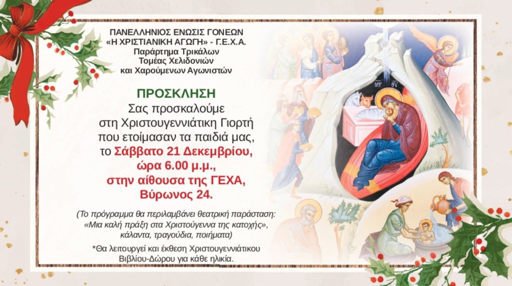 Το Σάββατο, 21 Δεκεμβρίου 2024 και ώρα 6:00 μ.μ., το Τμήμα Νεότητος της Πανελληνίου Ενώσεως Γονέων “Η Χριστιανική Αγωγή” διοργανώνει στην αίθουσα της ΓΕΧΑ, Βύρωνος 24, Χριστουγεννιάτικη Γιορτή, η οποία θα περιλαμβάνει τη θεατρική παράσταση “Μία καλή πράξη στα Χριστούγεννα της Κατοχής”, καθώς και κάλαντα, τραγούδια και ποιήματα.